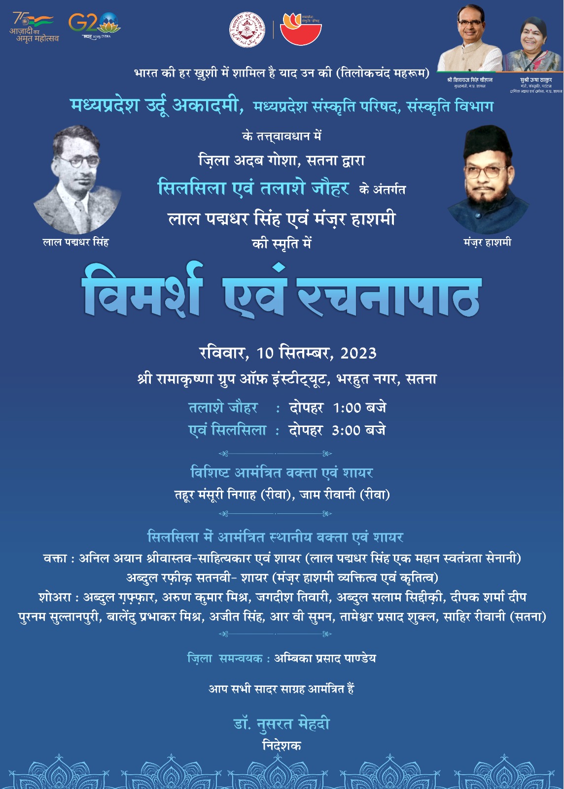 भारत की हर ख़ुशी में शामिल है याद उन की (तिलोकचंद महरूम) मध्यप्रदेश उर्दू अकादमी, मध्यप्रदेश संस्कृति परिषद, संस्कृति विभाग के तत्वावधान में ज़िला अदब गोशा, सतना द्वारा सिलसिला एवं तलाशे जौहर के अंतर्गत लाल पद्मधर सिंह एवं मंज़र हाशमी की स्मृति में विमर्श एवं रचनापाठ रविवार, 10 सितम्बर, 2023 श्री रामाकृष्णा ग्रुप ऑफ़ इंस्टीट्यूट, भरहुत नगर, सतना तलाशे जौहर : दोपहर 1:00 बजे एवं सिलसिला : दोपहर 3:00 बजे विशिष्ट आमंत्रित वक्ता एवं शायर तहूर मंसूरी निगाह (रीवा), जाम रीवानी (रीवा) सिलसिला में आमंत्रित स्थानीय वक्ता एवं शायर वक्ता: अनिल अयान श्रीवास्तव - साहित्यकार एवं शायर (लाल पद्मधर सिंह एक महान स्वतंत्रता सेनानी) अब्दुल रफ़ीक़ सतनवी शायर (मंज़र हाशमी व्यक्तित्व एवं कृतित्व) शोअरा : अब्दुल ग़फ़्फ़ार, अरुण कुमार मिश्र, जगदीश तिवारी, अब्दुल सलाम सिद्दीकी, दीपक शर्मा दीप पुरनम सुल्तानपुरी, बालेंदु प्रभाकर मिश्र, अजीत सिंह, आर वी सुमन, तामेश्वर प्रसाद शुक्ल, साहिर रीवानी (सतना) जिला समन्वयक : अम्बिका प्रसाद पाण्डेय आप सभी सादर साग्रह आमंत्रित हैं डॉ. नुसरत मेहदी निदेशक