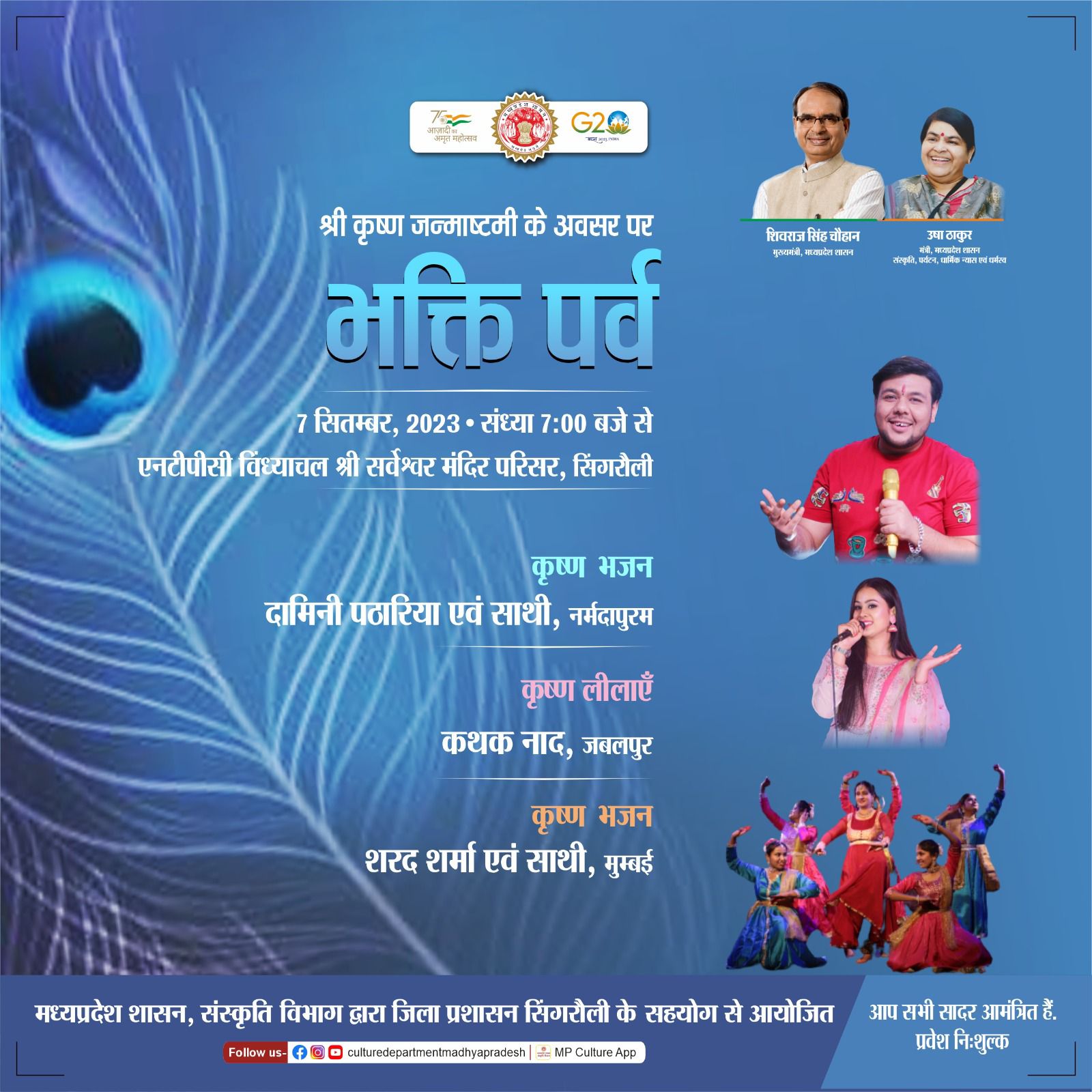मध्यप्रदेश शासन, संस्कृति विभाग द्वारा जिला प्रशासन सिंगरौली, पन्ना, दमोह और भिंड के सहयोग से श्री कृष्ण जन्माष्टमी के पावन अवसर पर ''भक्ति पर्व'' का आयोजन किया जा रहा है। चार जगहों पर होने वाले इन भव्य कार्यक्रमों में देश के विख्यात कलाकार अपनी प्रस्तुति से यशोदा नंदन का गुणगान करेंगे। ये प्रस्तुतियां 7 सितम्बर, 2023 को शाम 7 बजे से आरंभ होंगी। इन कार्यक्रमों में प्रवेश निःशुल्क है तथा आप सभी सादर आमंत्रित हैं।