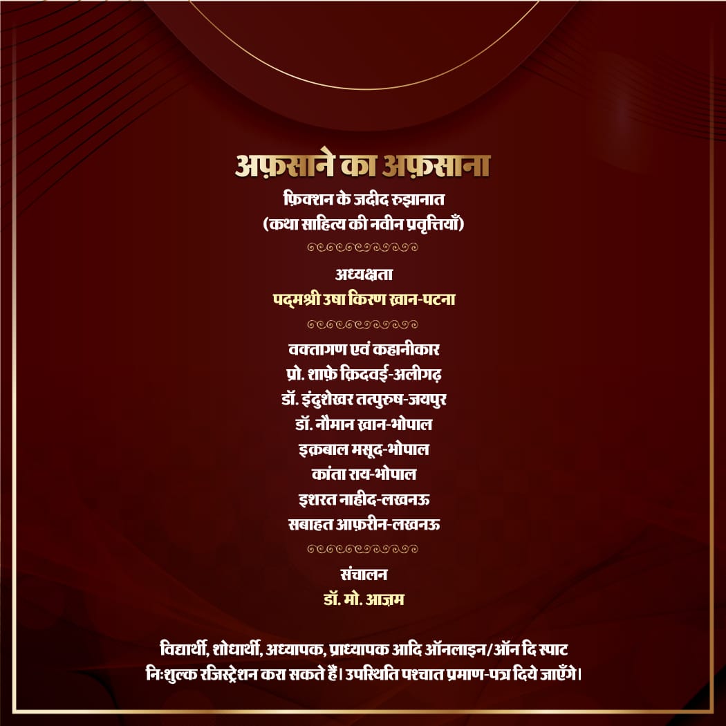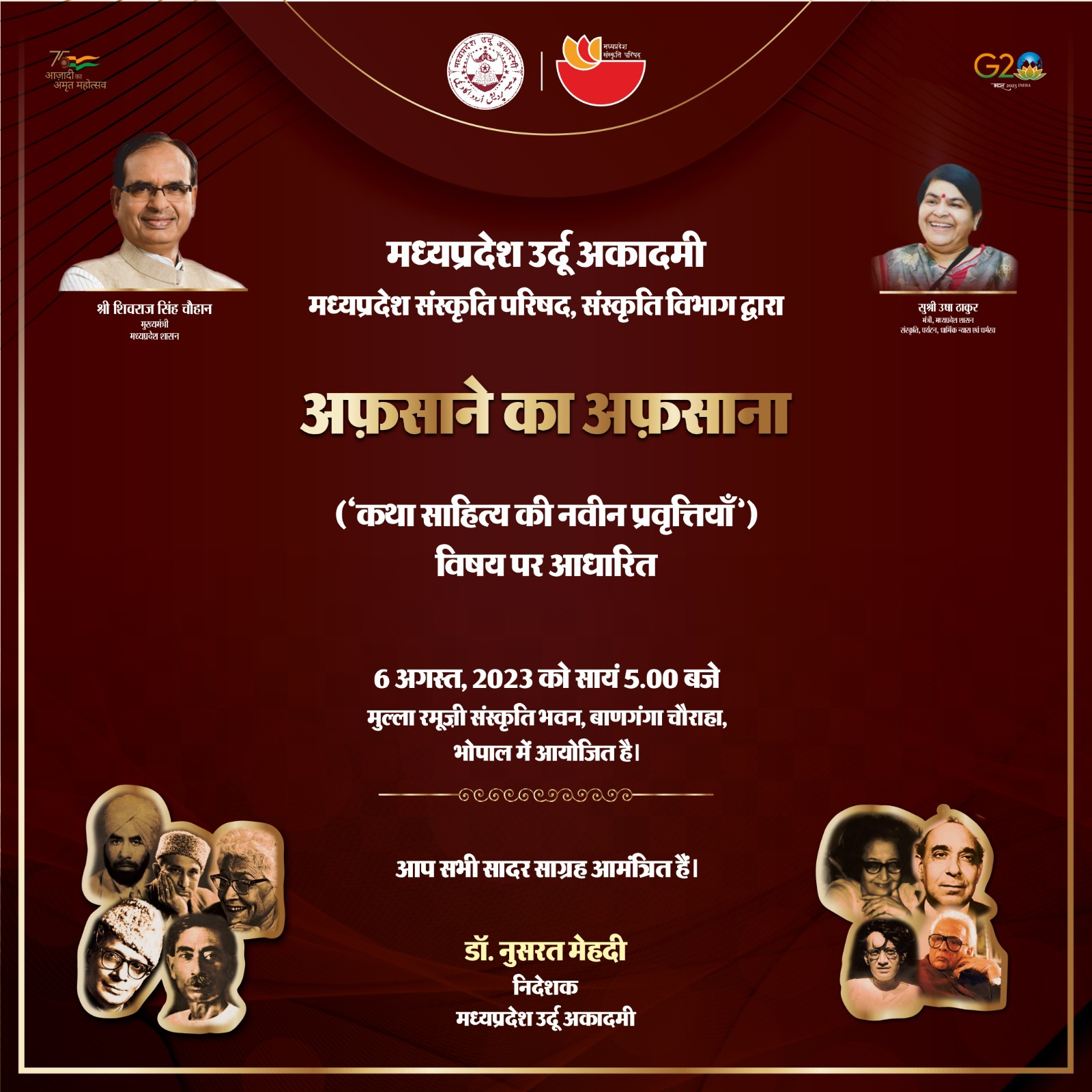 मध्यप्रदेश उर्दू अकादमी मध्यप्रदेश संस्कृति परिषद, संस्कृति विभाग द्वारा अफ़साने का अफ़साना ('कथा साहित्य की नवीन प्रवृत्तियाँ) विषय पर आधारित 6 अगस्त, 2023 को सायं 5.00 बजे जनजातीय संग्रहालय, सभागार, श्यामला हिल्स, भोपाल में आयोजित है। अध्यक्षता :पद्मश्री उषा किरण खान-पटना वक्तागण एवं कहानीकार प्रो. शाफ़े क़िदवाई - अलीगढ़, डॉ. इंदुशेखर तत्पुरुष - जयपुर, डॉ. नौमान खान - भोपाल, इक़बाल मसूद-भोपाल, कांता राय-भोपाल, इशरत नाहीद - लखनऊ, सबाहत आफ़रीन- लखनऊ संचालन डॉ. मो. आज़म आप सभी सादर साग्रह आमंत्रित हैं। डॉ. नुसरत मेहदी निदेशक