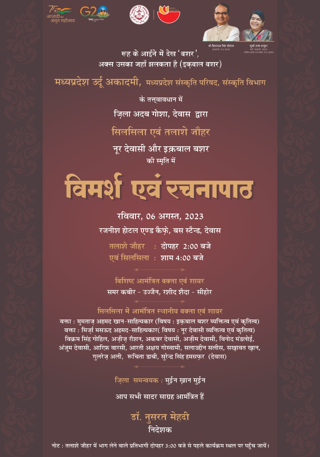रूह के आईने में देख 'बशर', अक्स उसका जहाँ झलकता है (इक़बाल बशर) मध्यप्रदेश उर्दू अकादमी, मध्यप्रदेश संस्कृति परिषद, संस्कृति विभाग के तत्त्वावधान में जिला अदब गोशा, देवास द्वारा सिलसिला एवं तलाशे जौहर नूर देवासी और इक़बाल बशर की स्मृति में विमर्श एवं रचनापाठ रविवार, 06 अगस्त, 2023 रजनीश होटल एण्ड कैफ़े, बस स्टैन्ड, देवास तलाशे जौहर : दोपहर 2:00 बजे एवं सिलसिला : शाम 4:00 बजे विशिष्ट आमंत्रित वक्ता एवं शायर समर कबीर उज्जैन, रशीद शैदा - सीहोर सिलसिला में आमंत्रित स्थानीय वक्ता एवं शायर वक्ता: मुमताज़ अहमद खान साहित्यकार (विषय: इक़बाल बशर व्यक्तित्व एवं कृतित्व) वक्ता: मिर्ज़ा मसऊद अहमद - साहित्यकार ( विषय : नूर देवासी व्यक्तित्व एवं कृतित्व) विक्रम सिंह गोहिल, अज़ीज़ रौशन, अकबर देवासी, अज़ीम देवासी, विनोद मंडलोई, अंजुम देवासी, आरिफ़ वारसी, आरती अक्षय गोस्वामी, सलाउद्दीन सलीस, सखावत खान, गुलरेज़ अली, रूचिता डाबी, सुरेन्द्र सिंह हमसफ़र (देवास) जिला समन्वयक: मुईन ख़ान मुईन आप सभी सादर साग्रह आमंत्रित हैं डॉ. नुसरत मेहदी निदेशक