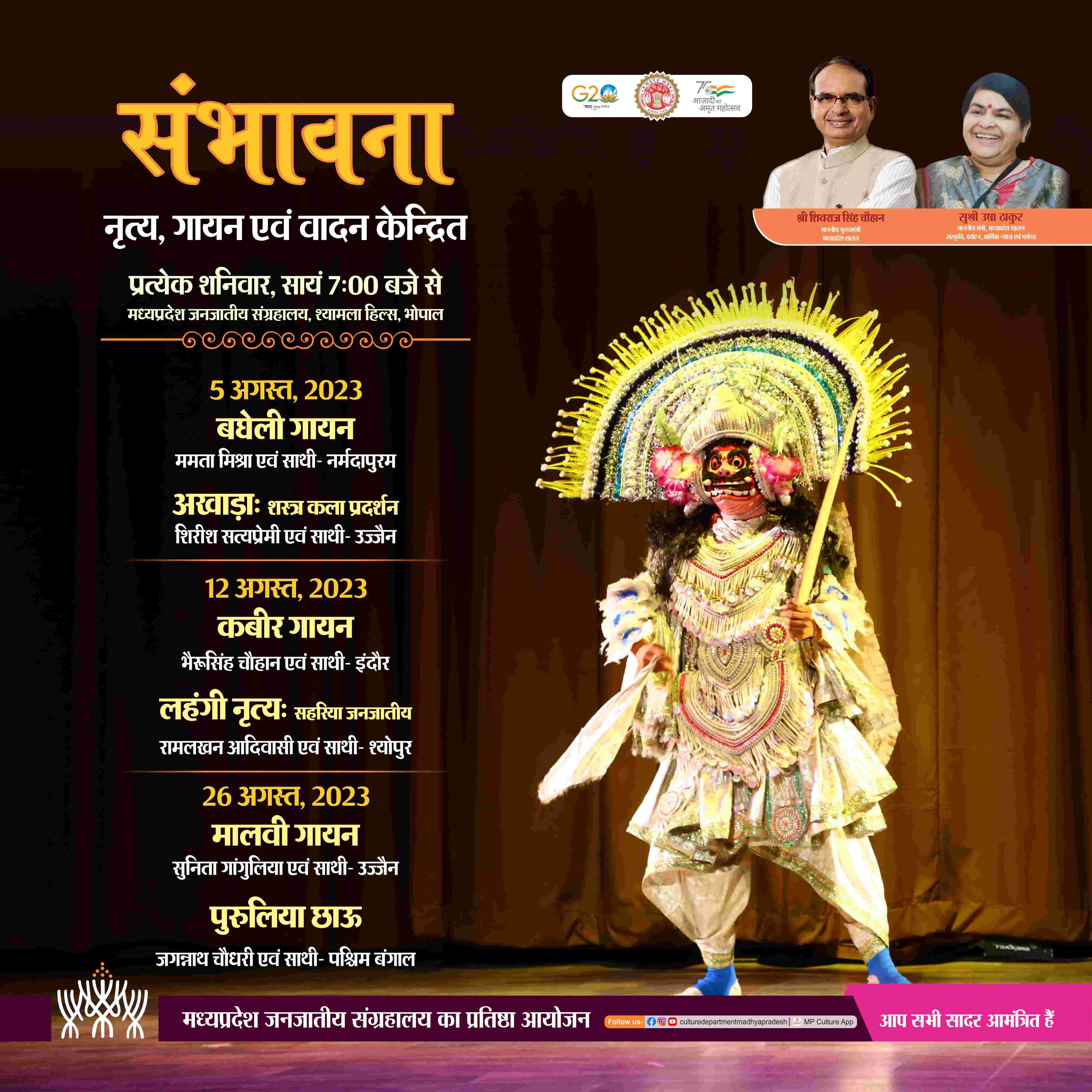 संभावना नृत्य, गायन एवं वादन केन्द्रित प्रत्येक शनिवार, सायं 7:00 बजे से मध्यप्रदेश जनजातीय संग्रहालय, श्यामला हिल्स, भोपाल मध्यप्रदेश जनजातीय संग्रहालय का प्रतिष्ठा आयोजन