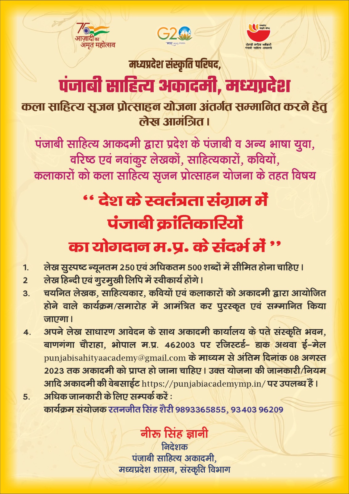 अकादमी द्वारा प्रदेश के पंजाबी व अन्य भाषा भाषी युवा, वरिष्ठ एवं नवांकुर लेखकों, साहित्यकारों, कवियों, कलाकारों को साहित्य सृजन प्रोत्साहन करने के लिये ‘‘देश के स्वतंत्रता संग्राम में पंजाबी क्रांतिकारियों का योगदान म.प्र. के संदर्भ में’’ पर लेख आमंत्रित किये गये हैं।