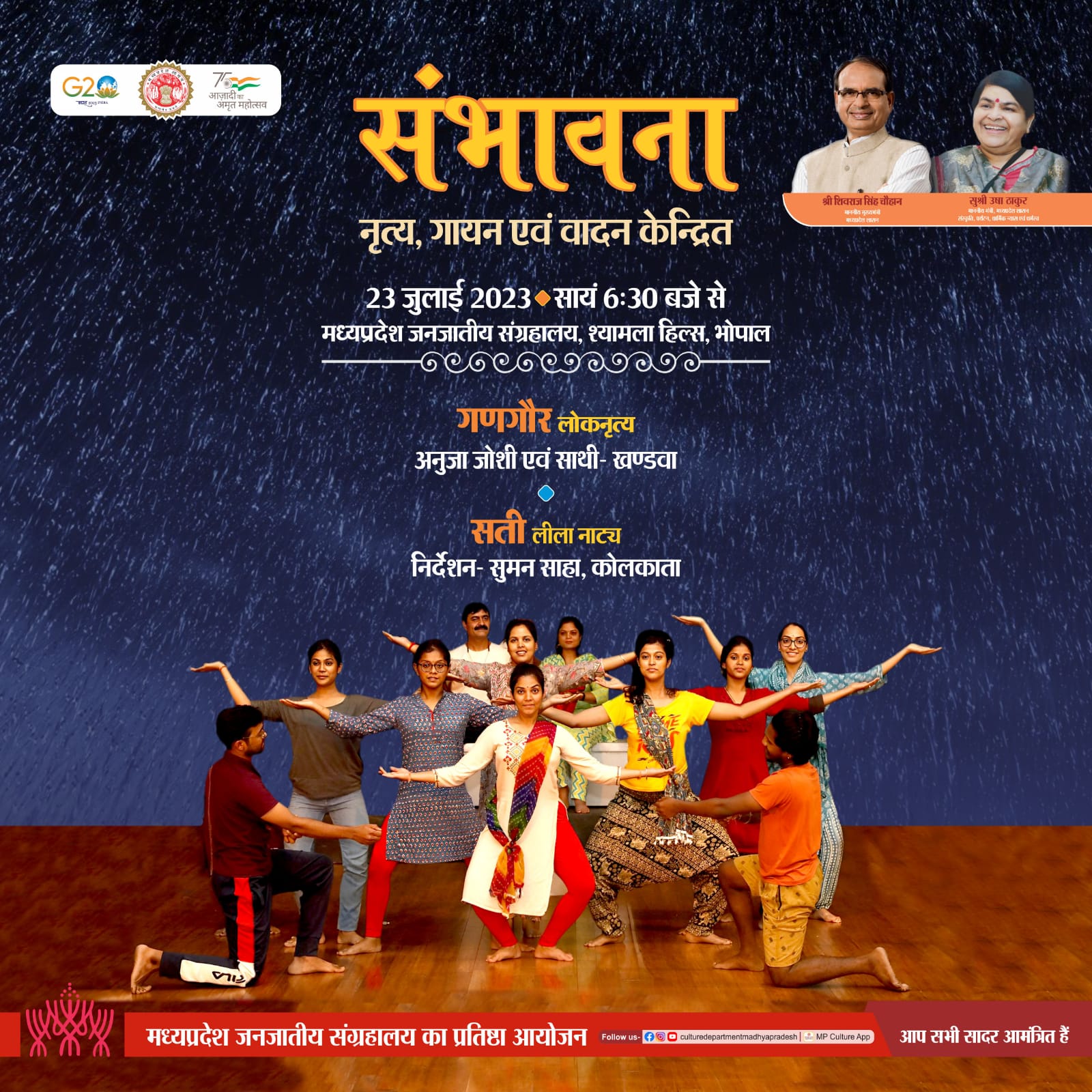 संभावना नृत्य, गायन एवं वादन केन्द्रित प्रत्येक शनिवार, सायं 6:30 बजे से मध्यप्रदेश जनजातीय संग्रहालय, श्यामला हिल्स, भोपाल मध्यप्रदेश जनजातीय संग्रहालय का प्रतिष्ठा आयोजन