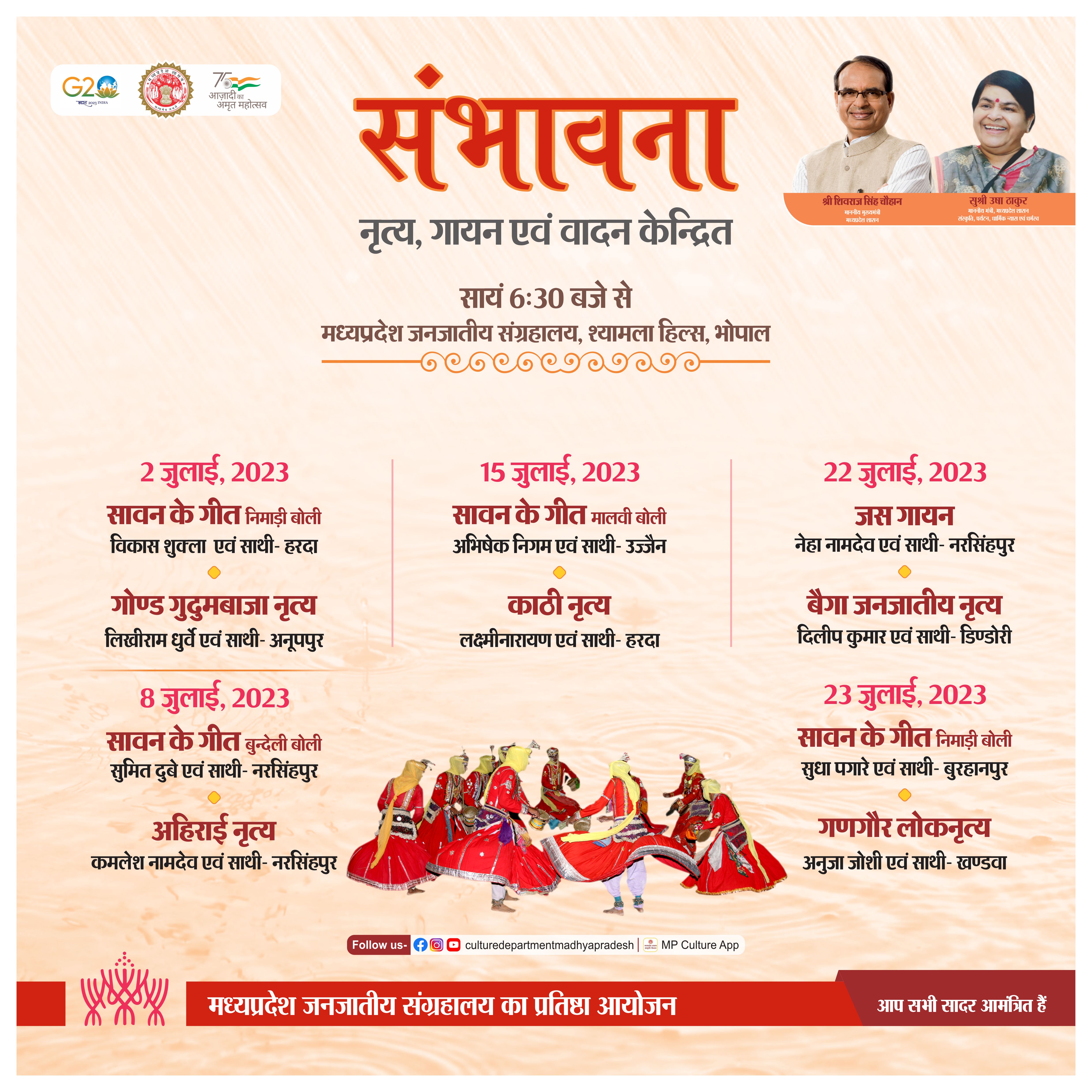 संभावना नृत्य, गायन एवं वादन केन्द्रित प्रत्येक शनिवार, सायं 6:30 बजे से मध्यप्रदेश जनजातीय संग्रहालय, श्यामला हिल्स, भोपाल मध्यप्रदेश जनजातीय संग्रहालय का प्रतिष्ठा आयोजन