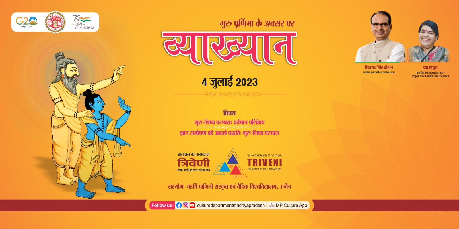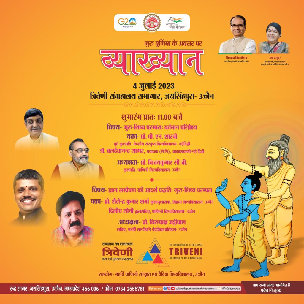 त्रिवेणी कला संग्रहालय - उज्जैन द्वारा गुरुपूर्णिमा के उपलक्ष्य में आयोजित श्रद्धा पर्व – 2023 के अन्तर्गत राष्ट्रीय शोध सङ्गोष्ठी का आयोजन दिनाङ्क 04/07/2023 के प्रातः 11 बजे से त्रिवेणी संग्रहालय सभागार में किया जा रहा है । संगोष्ठी के प्रथम सत्र में प्रो. बलदेवानन्द सागर, नई दिल्ली एवं प्रो. पी. एन्. शास्त्री, नई दिल्ली “गुरु-शिष्य परम्परा – वर्तमान परिप्रेक्ष्य” विषय पर उद्बोधन देंगे, द्वितीय सत्र में प्रो. विरूपाक्ष जड्डीपाल, उज्जैन एवं प्रो. शैलेन्द्रकुमार शर्मा, विक्रम विश्वविद्यालय – उज्जैन द्वारा “ज्ञान सम्प्रेषण की आदर्श पद्धति- गुरु-शिष्य परम्परा” विषय पर केन्द्रित व्याख्यान आयोजित होगा । कार्यक्रम की अध्यक्षता प्रो. विजयकुमार सी.जी., कुलपति, पाणिनि विश्वविद्यालय-उज्जैन द्वारा की जाएगी ।
