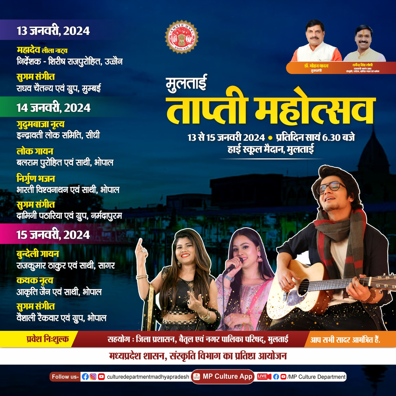 मध्यप्रदेश शासन, संस्कृति विभाग द्वारा जिला प्रशासन बैतूल और नगर पालिका परिषद मुलताई के सहयोग से प्रतिष्ठित ‘‘मुलताई ताप्ती महोत्सव’’ का आयोजन 13 से 15 जनवरी, 2024 को किया जा रहा है। इस भव्य महोत्सव में विख्यात कलाकार लीला नाट्य, लोक नृत्य, कथक नृत्य, लोक गीत, भजन, सुगम संगीत के कार्यक्रम प्रस्तुत करेंगे। इनमें प्रवेश निःशुल्क है तथा आप सभी सादर आमंत्रित हैं।