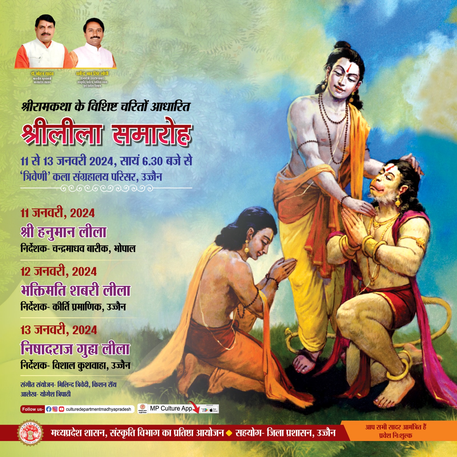 श्रीरामकथा के विशिष्ट चरितों आधारित श्रीलीला समारोह 11 से 13 जनवरी 2024, सायं 6.00 बजे सेत्रिवेणी' कला संग्रहालय परिसर, उज्जैन मध्यप्रदेश शासन, संस्कृति विभाग का प्रतिष्ठा आयोजन सहयोग - जिला प्रशासन, उज्जैन