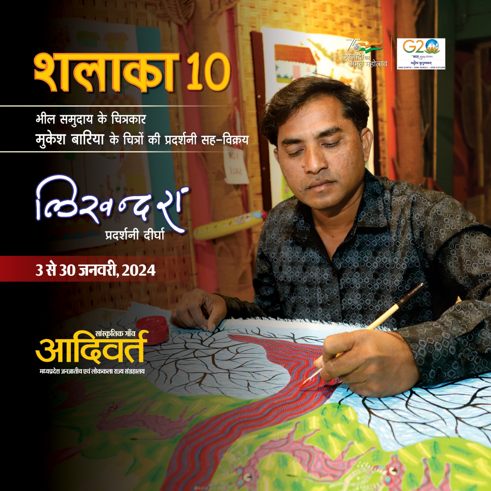 खजुराहो अदिवर्त्त जनजातीय संग्रहालय द्वारा प्रदेश के जनजातीय चित्रकारों को चित्र प्रदर्शनी और चित्रों की बिक्री के लिये सार्थक मंच उपलब्ध कराने की दृष्टि से प्रतिमाह 'लिखन्दरा प्रदर्शनी दीर्घा' में किसी एक जनजातीय चित्रकार की प्रदर्शनी सह विक्रय का संयोजन शलाका नाम से किया जाता है। इसी क्रम में 3 जनवरी, 2024 से भील समुदाय के चित्रकार श्री मुकेश बारिया के चित्रों की प्रदर्शनी सह-विक्रय का संयोजन किया गया है। 9वीं शलाका चित्र प्रदर्शनी 30 जनवरी,2024 तक निरंतर रहेगी। वर्ष 1984 में जन्में मुकेश बारिया भील समुदाय के युवा चित्रकार हैं। आपका जन्म ग्राम-छोटी बावड़ी, जिला-झाबुआ (मध्यप्रदेश) में हुआ है। आपके माता-पिता मजदूरी करते थे। छ: भाई-बहनों में सबसे छोटे मुकेश ने हायर सेकेण्डरी तक की शिक्षा ग्रहण की है। उन्हीं दिनों रोजगार की तलाश में माता-पिता राजधानी भोपाल आकर रहने लगे, तब से भोपाल ही आपका स्थाई निवास हो गया। भील समुदाय की चित्रकार गीता बारिया से आपका विवाह हुआ है। शुरुआत में आपने उनको चित्रकारी में सहयोग किया। यहीं से चित्रकारी के प्रति प्रेरणा और आवश्यक प्रोत्साहन मिला। पत्नी गीता बारिया की संगत में चित्रकला के प्रारंभिक गुर आपने सीखे और स्वतंत्र चित्रकारी करना शुरू किया। प्रारम्भ में उनके बनाए हुए चित्रों की प्रतिकृतियाँ बनाने का अभ्यास किया, फिर धीरे-धीरे स्वयं की शैली विकसित की। आप पिछले लगभग पन्द्रह वर्षों से चित्रकारी कर रहे हैं और अपने जीवनानुभवों और जातीय संस्कार-बोध को रूपाकार दे रहे हैं। आपके चित्रों में पशु-पक्षी, पेड़-पौधे एवं अपने पास-पड़ोस के वातावरण की झलक प्रमुखता से दिखाई देती है। आपने दिल्ली, मैसूर, बैंगलोर, हैदराबाद एवं विभिन्न कला-प्रदर्शनियों एवं चित्र-शिविरों में सक्रिय भागीदारी की है। कई प्रतिष्ठानों एवं संस्थानों के संग्रह में आपकी कला-कृतियों को संकलित किया गया है। आप अपनी सफलता का सम्पूर्ण श्रेय पत्नी गीता बारिया को देते हैं, जिनके मार्गदर्शन ने आपके कलापक्ष को और सुघड़ बनाने में मदद की। सम्पर्क - मोबाइल - 9179417614