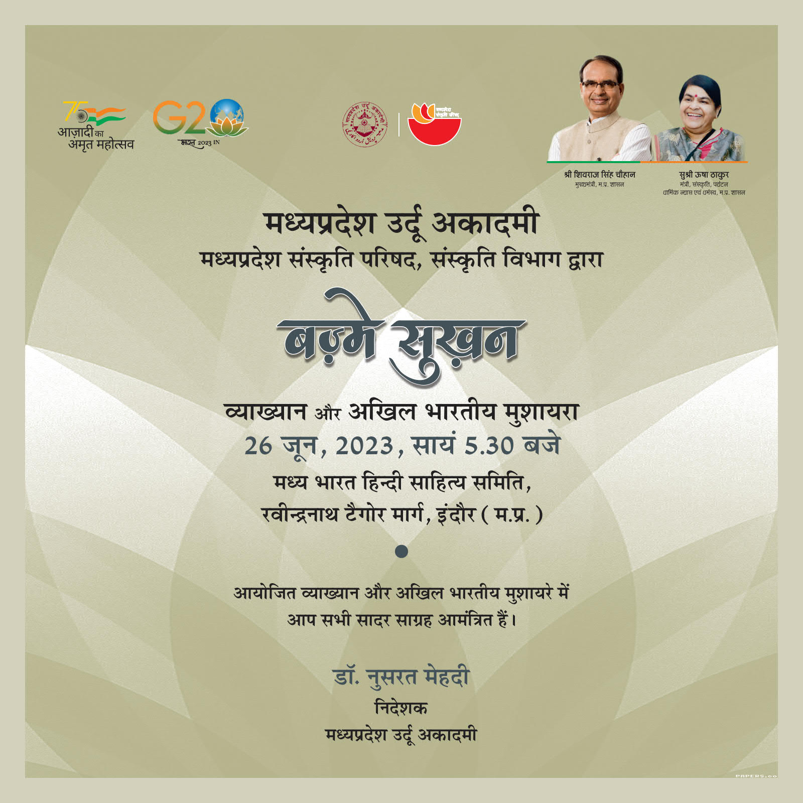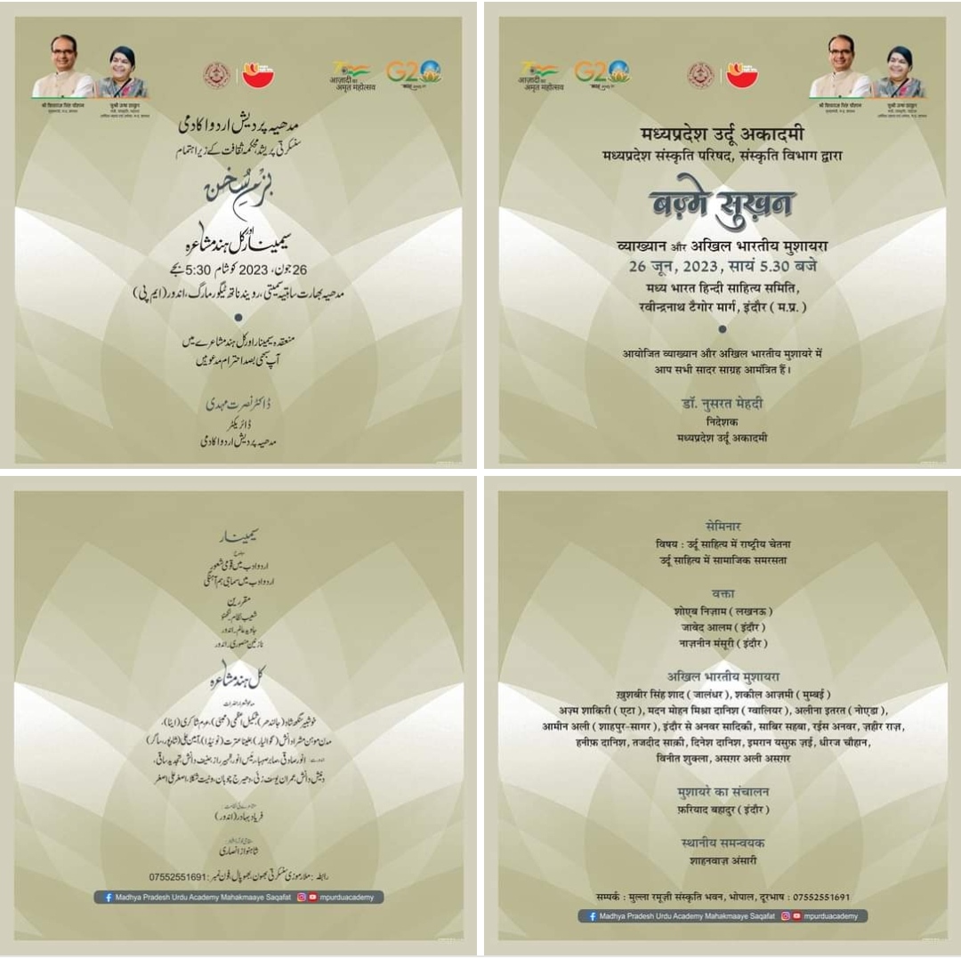 #Bazm_e_Sukhan #mpurduacademy #mpculturedeptt #Indore_Chapter मध्यप्रदेश उर्दू अकादमी मध्यप्रदेश संस्कृति परिषद, संस्कृति विभाग द्वारा बज़्मे-सुख़न व्याख्यान और अखिल भारतीय मुशायरा दिनाँक : 26 जून, 2023, सायं 5.30 बजे स्थान : मध्य भारत हिन्दी साहित्य समिति, रवीन्द्रनाथ टैगोर मार्ग, इंदौर (म.प्र.) व्याख्यान : शाम 5:30 बजे विषय : उर्दू साहित्य में राष्ट्रीय चेतना उर्दू साहित्य में सामाजिक समरसता आयोजित व्याख्यान और अखिल भारतीय मुशायरे में आप सादर साग्रह आमंत्रित हैं । डॉ. नुसरत मेहदी निदेशक मध्यप्रदेश उर्दू अकादमी Culture Department Madhya Pradesh Madhya Pradesh Urdu Academy, Mahakmaaye Saqafat