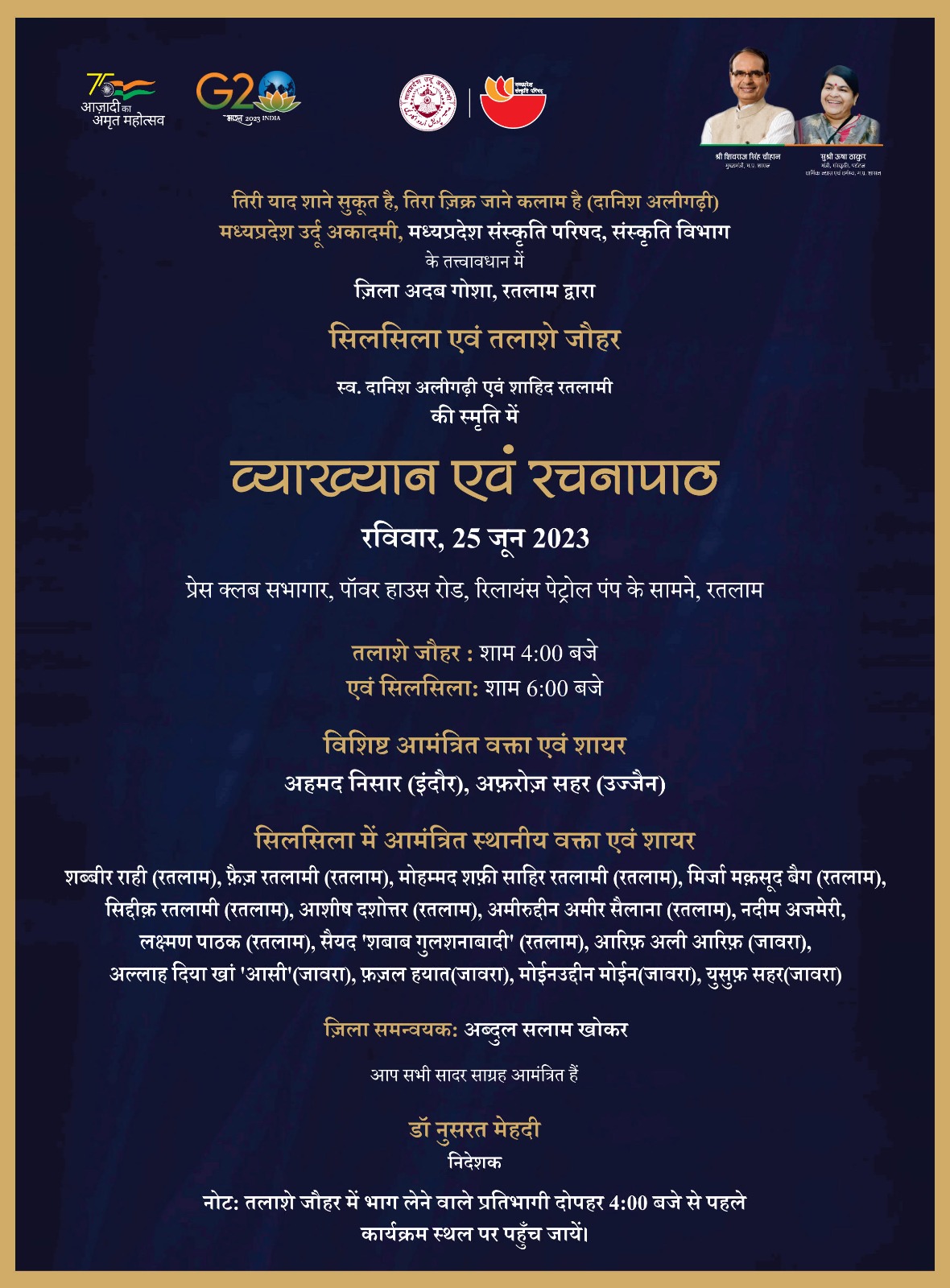 तिरी याद शाने सुकूत है, तिरा ज़िक्र जाने कलाम है (दानिश अलीगढ़ी) मध्यप्रदेश उर्दू अकादमी, मध्यप्रदेश संस्कृति परिषद, संस्कृति विभाग के तत्त्वावधान में ज़िला अदब गोशा, रतलाम द्वारा सिलसिला एवं तलाशे जौहर स्व. दानिश अलीगढ़ी एवं शाहिद रतलामी की स्मृति में व्याख्यान एवं रचनापाठ रविवार, 25 जून 2023 प्रेस क्लब सभागार, पॉवर हाउस रोड, रिलायंस पेट्रोल पंप के सामने, रतलाम तलाशे जौहर : शाम 4:00 बजे एवं सिलसिला : शाम 6:00 बजे विशिष्ट आमंत्रित वक्ता एवं शायर अहमद निसार (इंदौर), अफ़रोज़ सहर (उज्जैन) सिलसिला में आमंत्रित स्थानीय वक्ता एवं शायर शब्बीर राही (रतलाम), फ़ैज़ रतलामी (रतलाम), मोहम्मद शफ़ी साहिर रतलामी (रतलाम), मिर्जा मक़सूद बैग (रतलाम), सिद्दीक़ रतलामी (रतलाम), आशीष दशोत्तर (रतलाम), अमीरुद्दीन अमीर सैलाना (रतलाम), नदीम अजमेरी(रतलाम) , लक्ष्मण पाठक (रतलाम), सैयद शबाब गुलशनाबादी' (रतलाम), आरिफ़ अली आरिफ़ (जावरा), अल्लाह दिया खां 'आसी' (जावरा), फ़ज़ल हयात (जावरा), मोईनउद्दीन मोईन (जावरा), युसुफ़ सहर (जावरा) ज़िला समन्वयक: अब्दुल सलाम खोकर आप सभी सादर साग्रह आमंत्रित हैं। डॉ. नुसरत मेहदी निदेशक