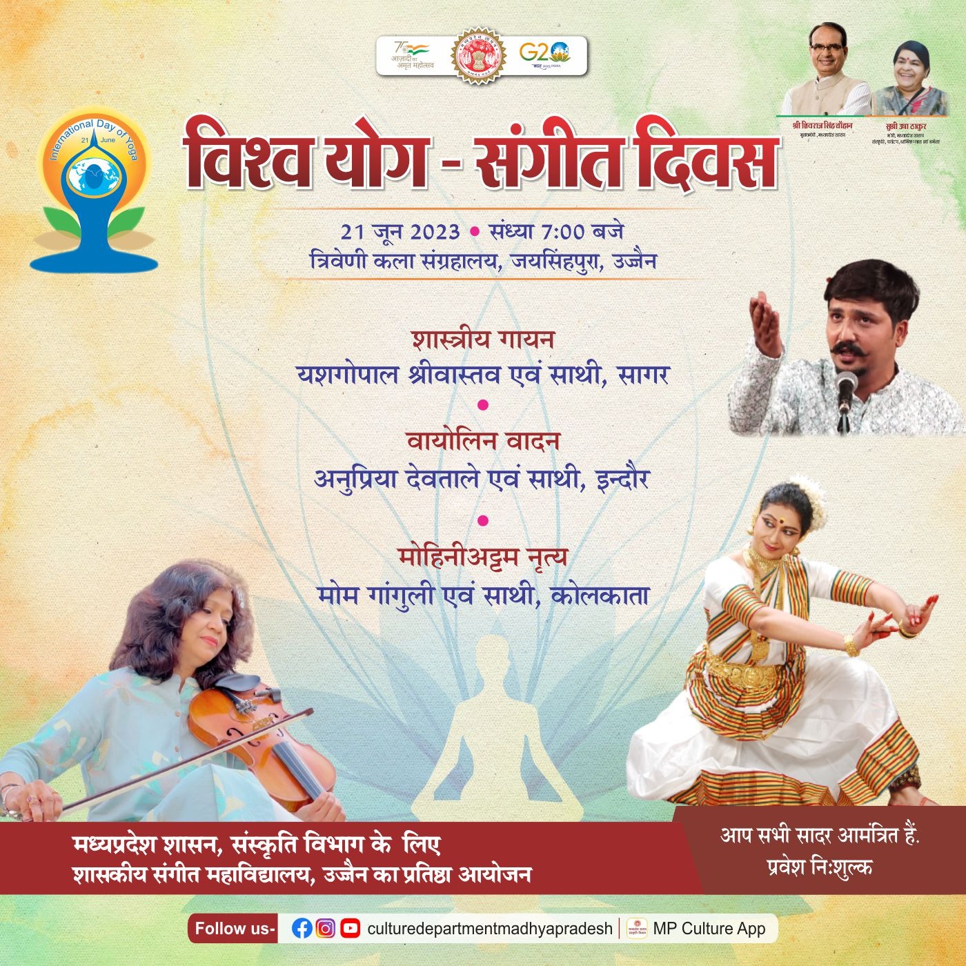 विश्व योग — संगीत दिवस के विशिष्ट अवसर पर 21 जून, 2023 को सायं 07:00 बजे त्रिवेणी कला संग्रहालय, जयसिंहपुरा, उज्जैन श्री यश गोपाल श्रीवास्तव एवं साथी, सागर द्वारा शास्त्रीय गायन सुश्री अनुप्रिया देवताले एवं साथी, इन्दौर द्वारा वायोलिन वादन एवं सुश्री मोम गांगुली एवं साथी, कोलकाता द्वारा मोहिनीअट्टम नृत्य की प्रस्तुतियां होंगी। प्रवेश निःशुल्क आप सभी आग्रहपूर्वक आमंत्रित हैं