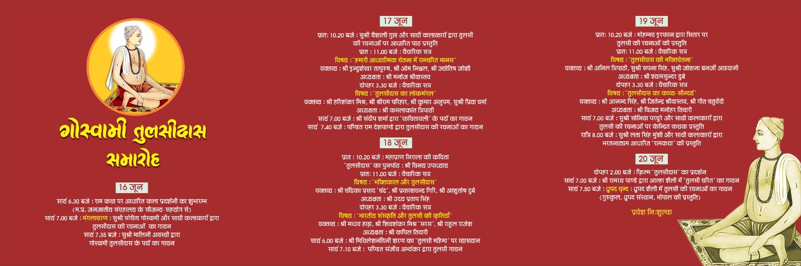 18 जून-प्रातः 10:20 बजे: महाप्राण निराला की कविता 'तुलसीदास का पुनर्पाठ'- श्री विनय उपाध्याय. प्रातः 11:00 बजे: वैचारिक सत्र विषय- 'भक्तिकाल और तुलसीदास' वक्तव्य-श्री चंद्रिका प्रसाद 'चंद्र', श्री प्रकाशचंद्र गिरि, श्री आशुतोष दुबे, अध्यक्षता- उदय प्रताप सिंह दोपहर 3:30 बजे: वैचारिक सत्र, विषय-'भारतीय संस्कृति और तुलसी की कृतियॉं' वक्तव्य: श्री माधव हाड़ा, श्री शिवशंकर मिश्र 'सरस', श्री राहुल राजेश अध्यक्षता: श्री कपिल तिवारी सायं 6:00 बजे-श्री मिथिलेशनंदनीशरण का तुलसी महिमा पर व्याख्यान शाम 7:10 बजे-पंडित संजीव अभ्यंकर व्दारा तुलसी गायन