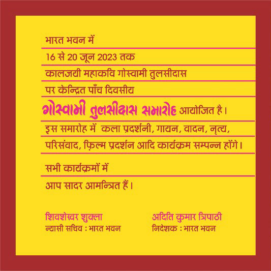 गोस्वामी तुलसीदास समारोह (16—20 जून) अंतर्गत 16 जून, 2023 सायं 7:00 बजे मंगलाचरण गायिका सुश्री संगीता गोस्वामी एवं साथी कलाकारों द्वारा गोस्वामी तुलसीदास की रचनाओं का गायन भारत भवन का आयोजन प्रवेश निःशुल्क आप सभी आग्रहपूर्वक आमंत्रित हैं