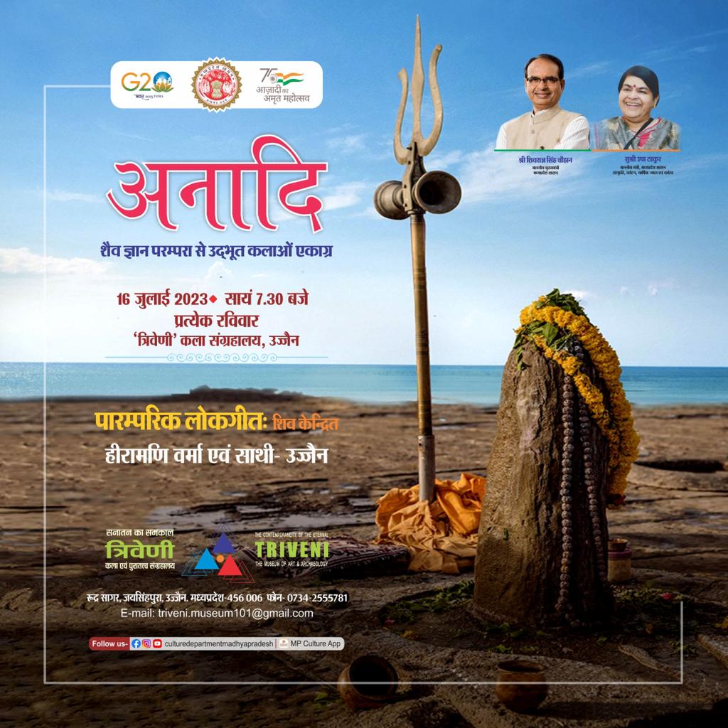 शैव ज्ञान परंपरा से उद्भूत कलाओं पर एकाग्र साप्ताहिक श्रंखला अनादि के अन्तर्गत दिनांक 16 जुलाई 2023 को शिव केन्द्रित पारंपरिक लोकगीतों का प्रस्तुतिकरण त्रिवेणी संग्रहालय परिसर में होगा ।