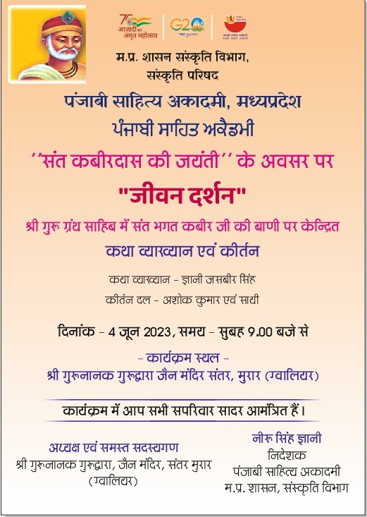 संत कबीर जी की जयंती के अवसर पर श्री गुरू ग्रंथ साहिब में संत भगत कबीर जी की बाणी पर केन्द्रित *जीवन दर्शन* कथा व्याख्यान एवं कीर्तन का आयोजन दिनांक -4 जून 2023 स्थान - गुरू नानक गुरूद्वारा जैन मंदिर संतर, मुरार (ग्वालियर) समय 9.00 am