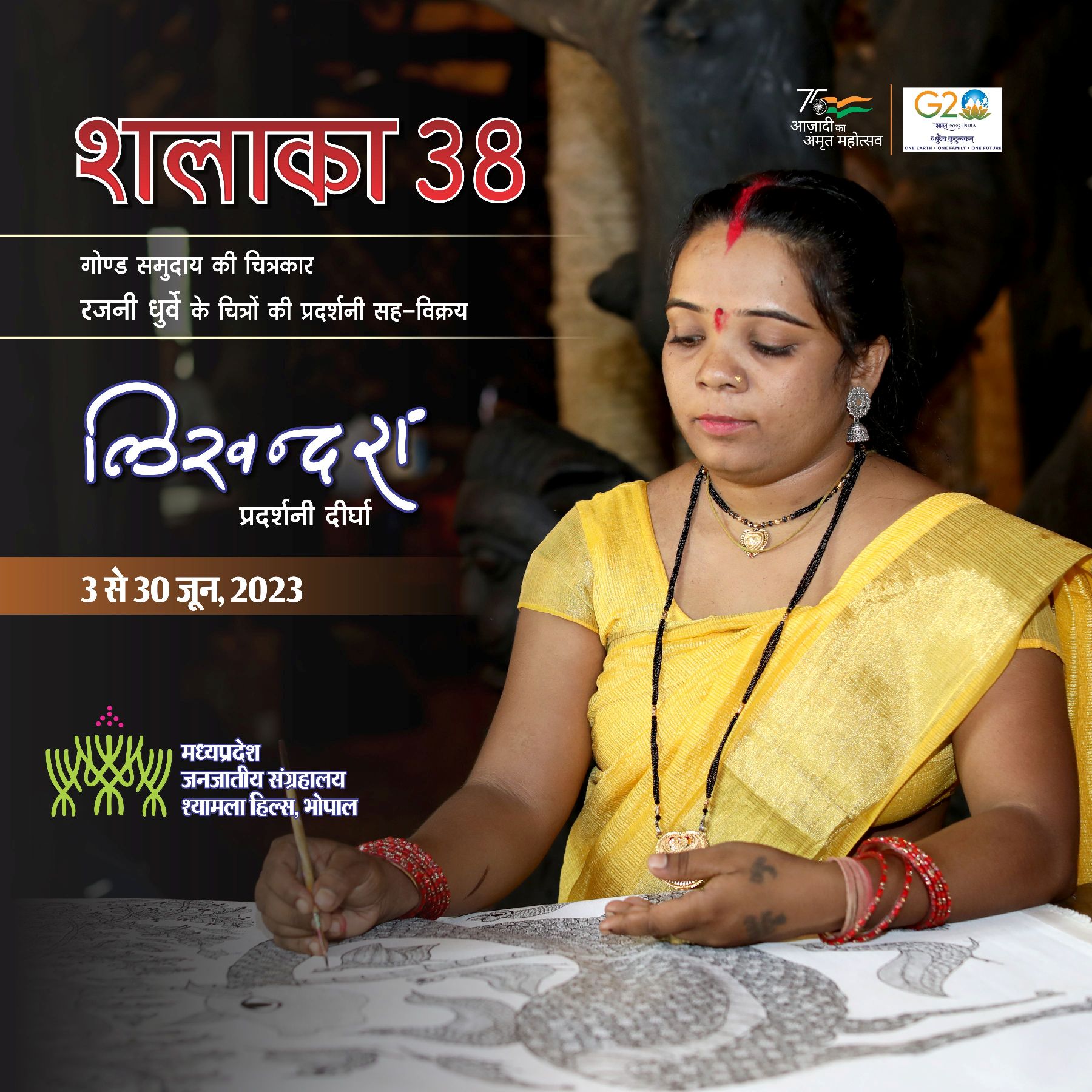 शलाका 38 गोंड समुदाय की चित्रकार रजनी धुर्वे के चित्रों की प्रदर्शनी सह विक्रय लिखन्दरा प्रदर्शनी दीर्घा 3 से 30 जून , 2023 मध्यप्रदेश जनजातीय संग्रहालय श्यामला हिल्स, भोपाल