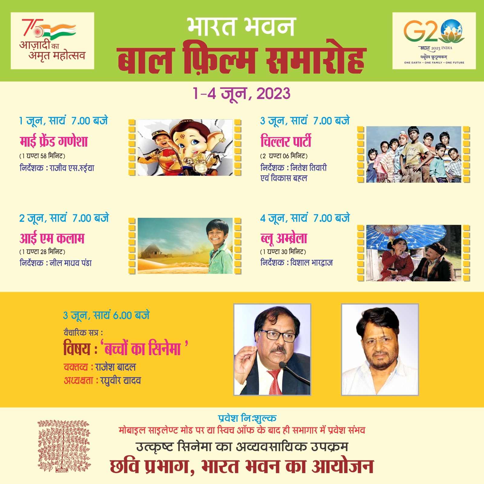भोपाल स्थित भारत भवन में 1 से 4 जून, 2023 तक ‘‘बाल फिल्म समारोह’’ आयोजित होगा। दर्शकों के लिए शाम 7 बजे से मज़ेदार फिल्में दिखाई जाएंगी। 3 जून को शाम 6 बजे ‘‘बच्चों का सिनेमा’’ विषय पर विशेष सत्र भी होगा। इसमें श्री राजेश बादल जी वक्तव्य देंगे और प्रसिद्ध अभिनेता श्री रघुबीर यादव अध्यक्षता करेंगे। इस आयोजन में प्रवेश निःशुल्क है।