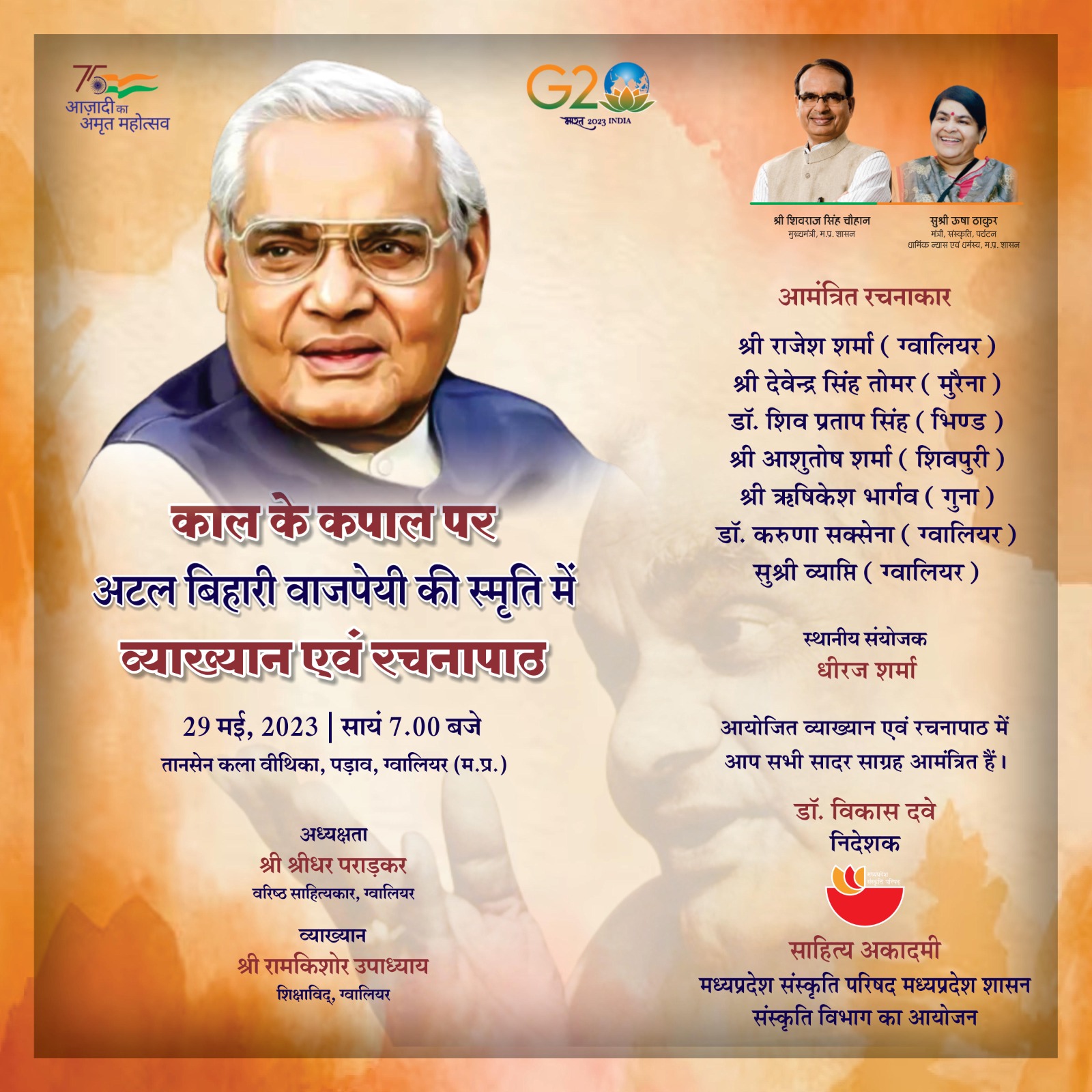 साहित्य अकादमी, मध्यप्रदेश संस्कृति परिषद, मध्यप्रदेश शासन, संस्कृति विभाग द्वारा अटल बिहारी वाजपेयी जी की स्मृति में दिनांक 29 मई, 2023 को सायं 7.00 बजे कला वीथिका, पड़ाव, ग्वालियर (म.प्र.) में 'काल के कपाल पर' विषय पर व्याख्यान और रचनापाठ होगा। इस अवसर पर आप सभी सादर साग्रह आमंत्रित हैं। डॉ. विकास दवे निदेशक साहित्य अकादमी, भोपाल