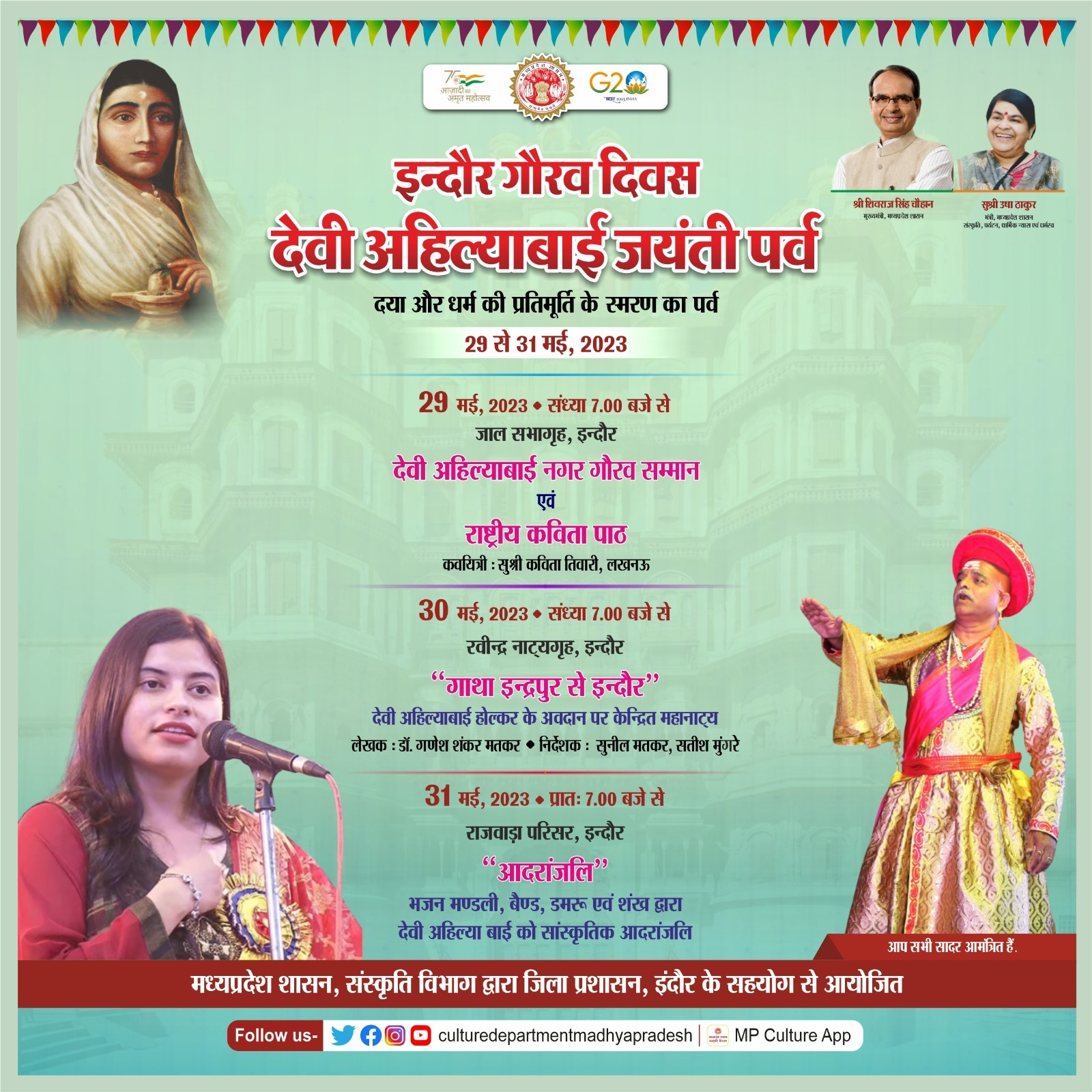 मध्यप्रदेश शासन, संस्कृति विभाग द्वारा जिला प्रशासन इन्दौर के सहयोग से पहली बार देवी अहिल्याबाई की जयंती अवसर पर भव्य समारोह का आयोजन होने जा रहा है। इसके तहत इन्दौर में दिनांक 29 मई से 31 मई, 2023 तक एवं महेश्वर में 30 एवं 31 मई, 2023 को देवी अहिल्याबाई जयंती पर्व आयोजित किया जावेगा। संचालक संस्कृति श्री अदिति कुमार त्रिपाठी ने बताया कि इंदौर में 29 मई को जाल सभागृह में संध्या 7 बजे से देवी अहिल्याबाई नगर गौरव सम्मान प्रदान किए जावेंगे। तत्पश्चात राष्ट्रीय कविता पाठ का आयोजन होगा, जिसमें कवयित्री सुश्री कविता तिवारी, लखनऊ का कविता पाठ होगा। कार्यक्रम में मुख्य अतिथि माननीय संस्कृति मंत्री सुश्री उषा ठाकुर होंगी। दूसरे दिवस 30 मई को रवीन्द्र नाट्यगृह में संध्या 7 बजे से ‘गाथा इंद्रपुर से इन्दौर’ महानाट्य का मंचन सुनील मतकर एवं सतीश मुंगरे के निर्देशन में होगा। तीसरे दिवस 31 मई को प्रातः 7 बजे से राजबाड़ा परिसर में आदरांजलि कार्यक्रम का आयोजन होगा, जिसके तहत भजन मंडली, बैंड, डमरू एवं शंख द्वारा देवी अहिल्याबाई को सांस्कृतिक आदरांजलि दी जावेगी।