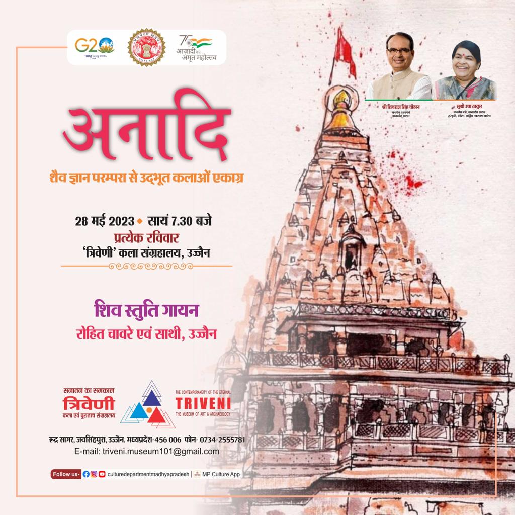 त्रिवेणी कला संग्रहालय - उज्जैन द्वारा आयोजित शैव ज्ञान परम्परा से उद्भूत कलाओं पर एक्राग्र साप्ताहित श्रंखला अनादि के अन्तर्गत शिव स्तुति गायन की प्रस्तुति श्री रोहित चावरे एवं साथी कलाकारों द्वारा प्रस्तुत होगी ।