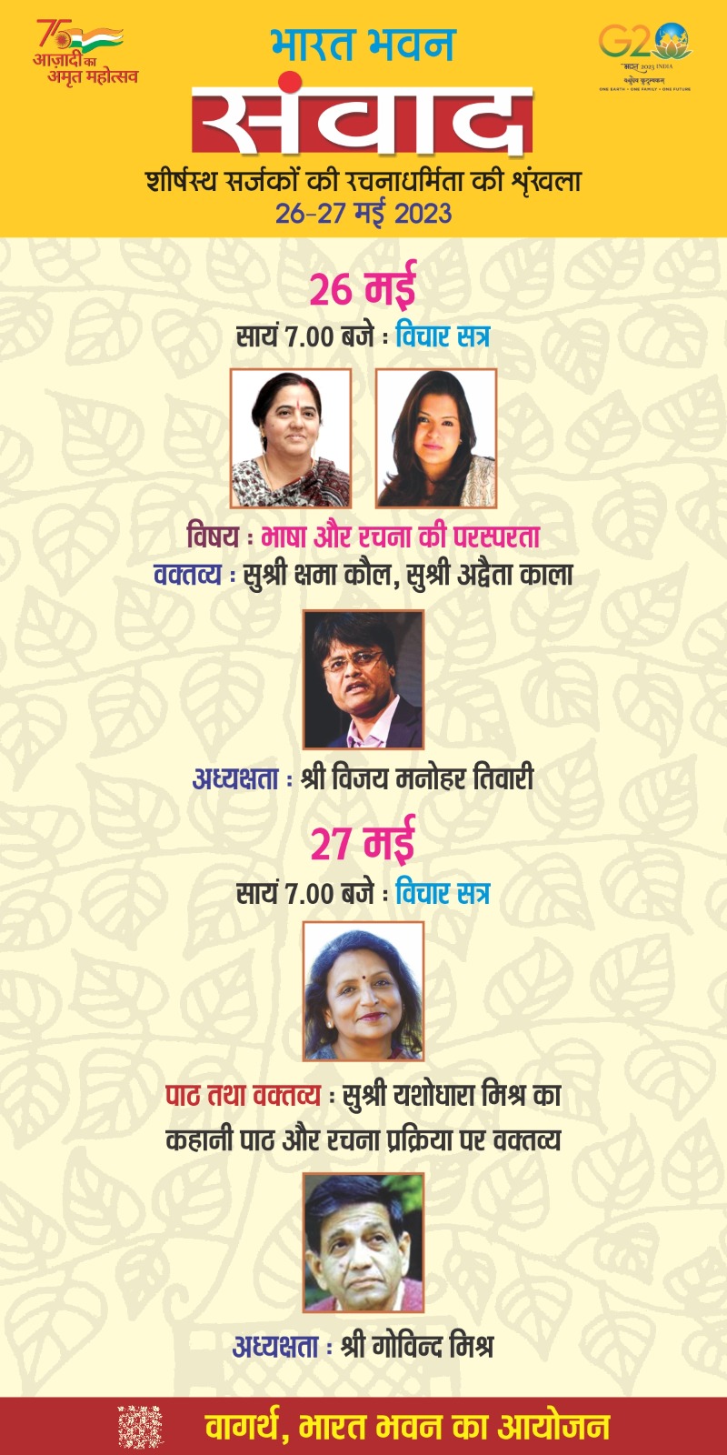 भारत भवन में संवाद कार्यक्रम 26 मई: शाम 7 बजे: विचार सत्र विषय : भाषा और रचना की परस्परता वक्तव्य : सुश्री क्षमा कौल, सुश्री अव्दैता काला अध्यक्षता : श्री विजय मनोहर तिवारी 27 मई: शाम 7 बजे: विचार सत्र पाठ तथा वक्तव्य : सुश्री यशोधारा मिश्र का कहानी और रचना प्रक्रिया पर वक्तव्य अध्यक्षता : श्री गोविन्द मिश्र.