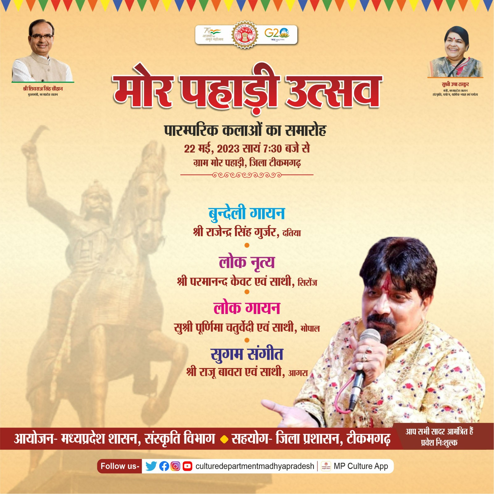 मोर पहाड़ी उत्सव पारम्परिक कलाओं का समारोह 22 मई, 2023 सायं 7:30 बजे से ग्राम मोर पहाड़ी, जिला टीकमगढ़ लोक नृत्य श्री परमानन्द केवट एवं साथी सिरोज लोक गायन सुश्री पूर्णिमा चतुर्वेदी एवं साथी भोपाल सुगम संगीत श्री राजू बावरा एवं साथी आगरा मध्यप्रदेश शासन, संस्कृति विभाग एवं जिला प्रशासन, टीकमगढ़