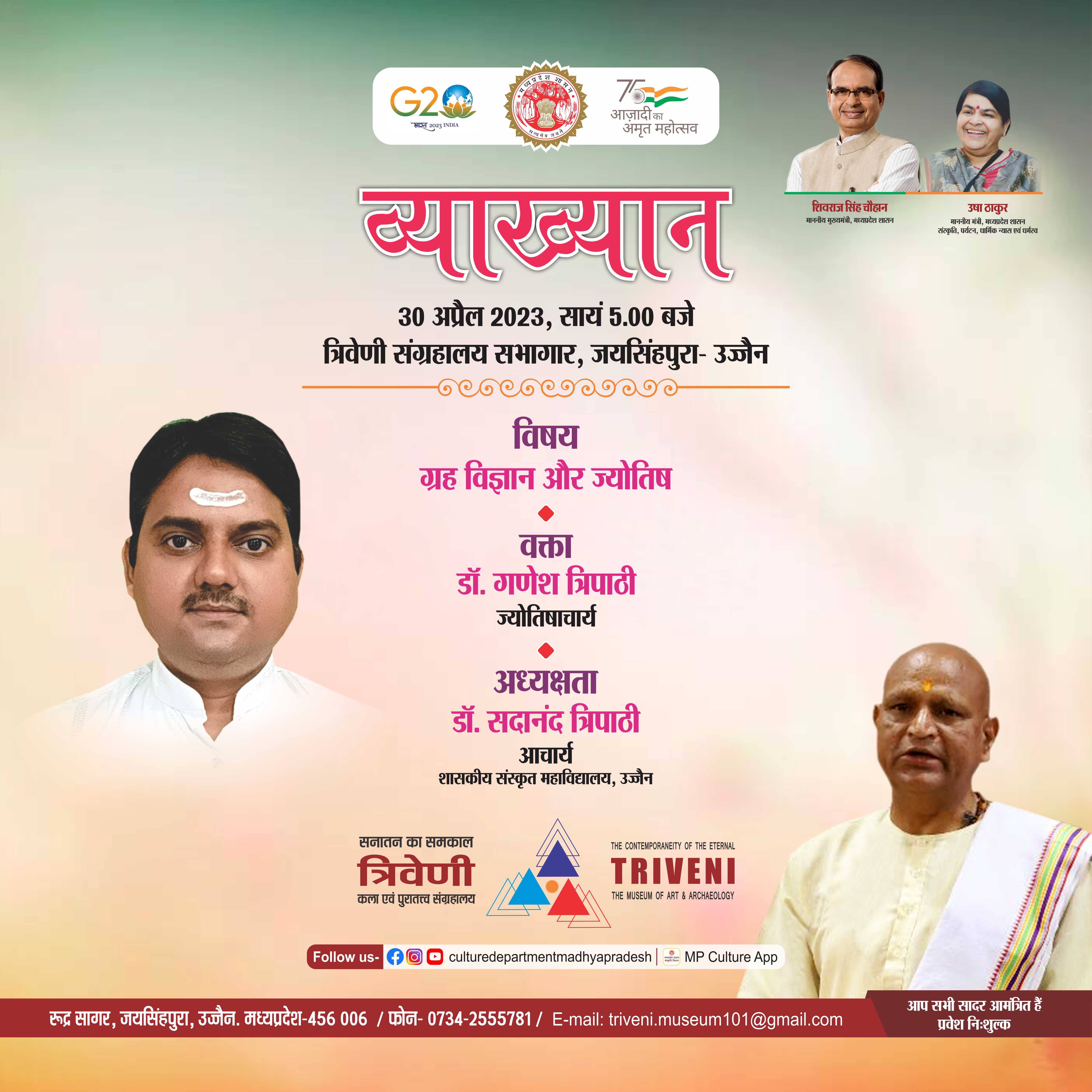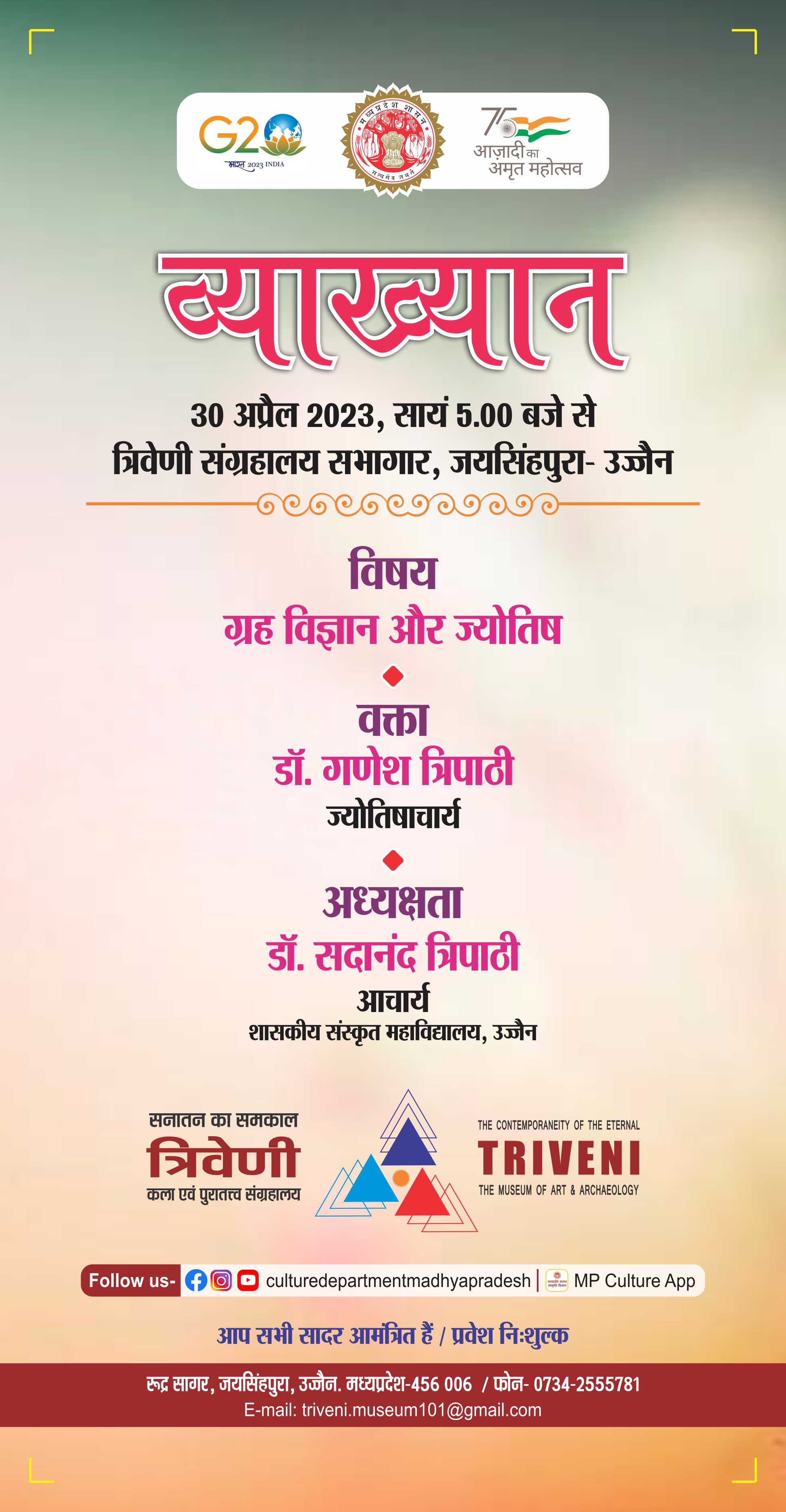 व्याख्यान आयोजन विषय – ग्रह विज्ञान और ज्योतिष वक्ता – डॉ. गणेश त्रिपाठी, सहायक प्राध्यापक (ज्योतिष) शा. रामानंद संस्कृत महाविद्यालय, गुफा मंदिर लालघाटी, भोपाल अध्यक्षता – डॉ. सदानंन्द त्रिपाठी आचार्य, शा. संस्कृत महाविद्यालय - उज्जैन दिनांक 30 अप्रैल 2023 – रविवार स्थान – त्रिवेणी कला एवं पुरातत्व संग्रहालय - उज्जैन समय सायं 05 बजे प्रवेश - निःशुल्क