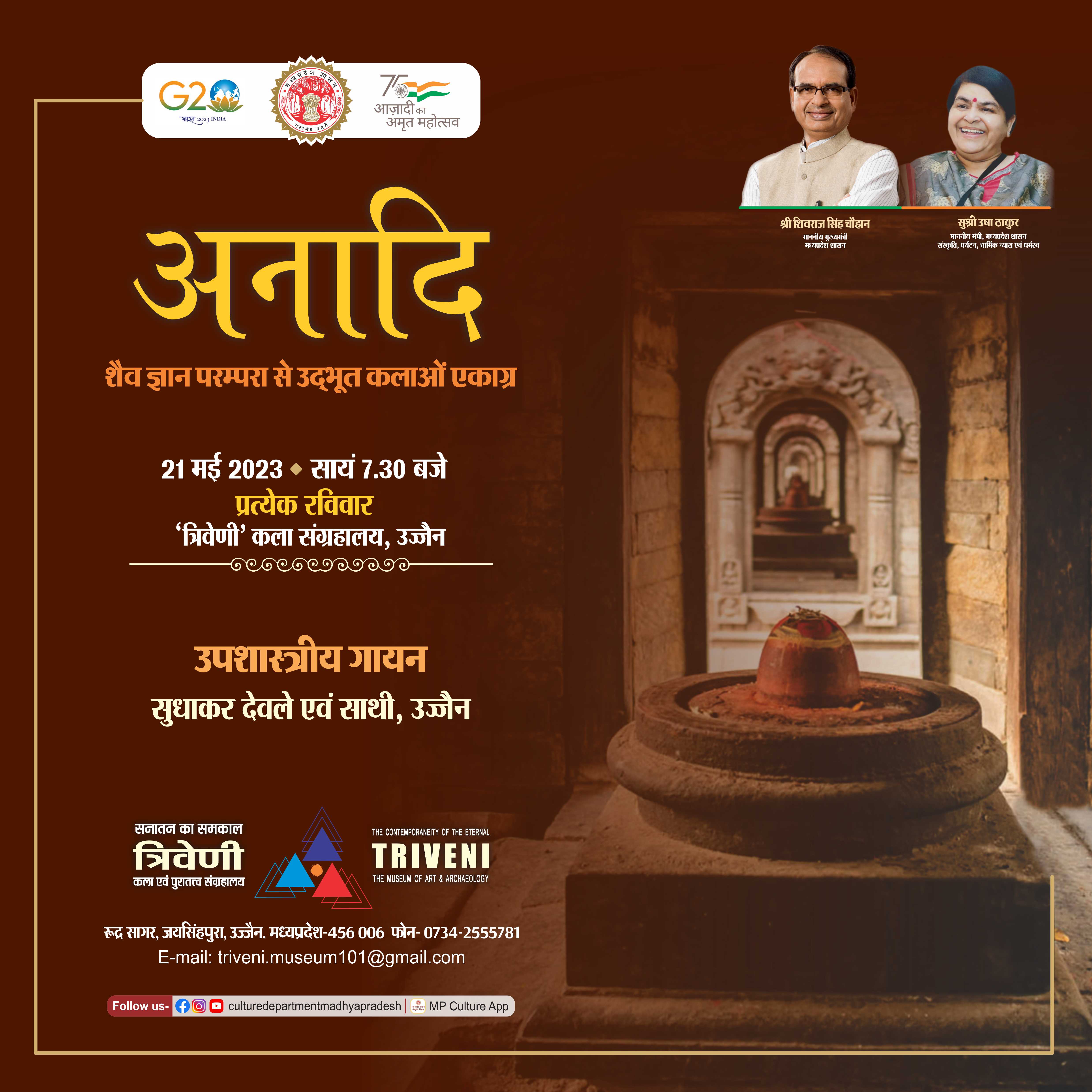 त्रिवेणी कला संग्रहालय - उज्जैन द्वारा आयोजित शैव ज्ञान परंपरा से उद्भूत कलाओं एकाग्र अनादि श्रंखला के अन्तर्गत दिनांक 21 मई 2023 को श्री सुधाकर देवले एवं साथियों द्वारा शिव आधारित उपशास्त्रीय गायन प्रस्तुत होगा ।