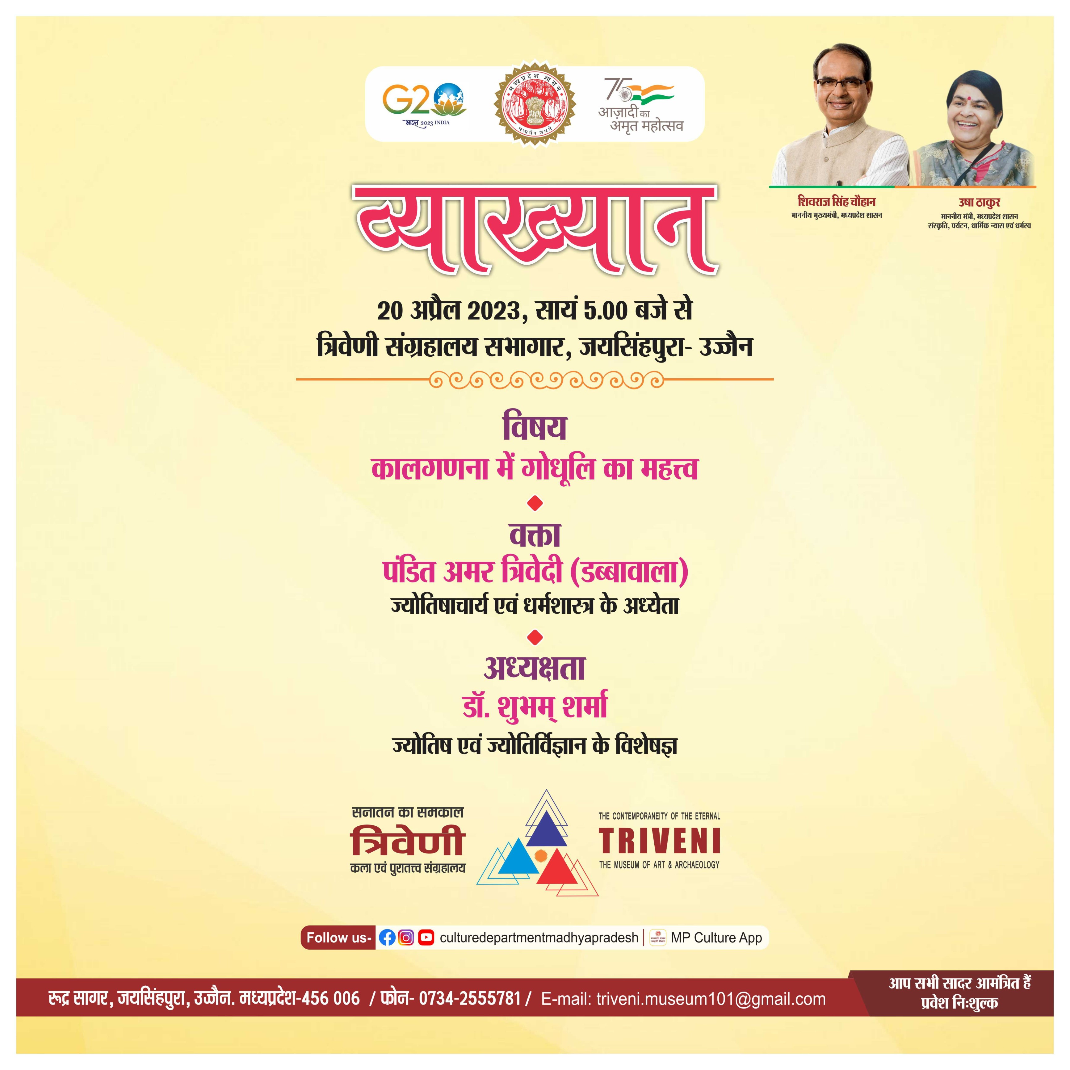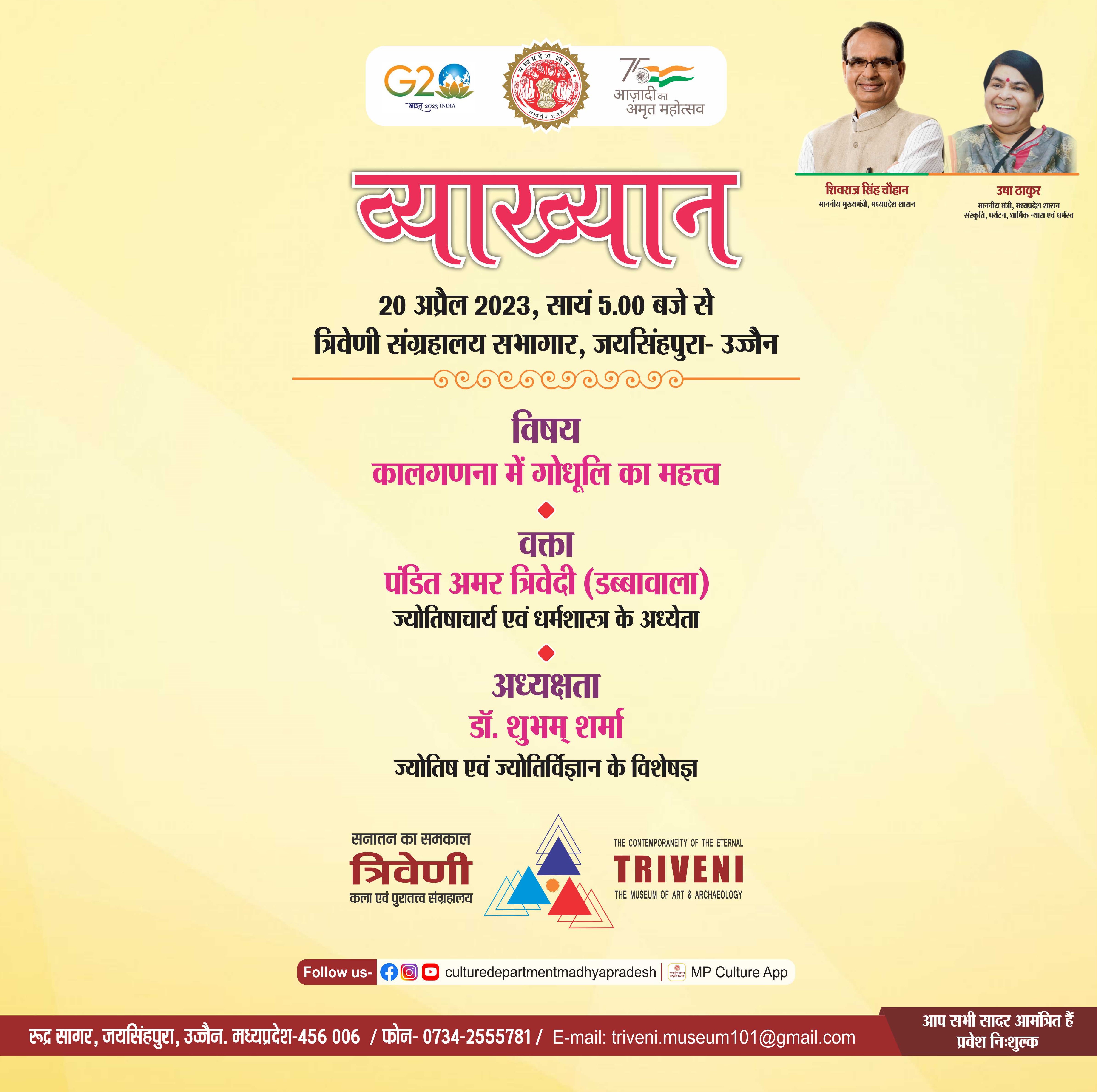 व्याख्यान सत्र / विषय - कालगणना में गोधुली का महत्व / मुख्यवक्ता - पंडित अमर त्रिवेदी, ज्योतिषाचार्य एवं धर्मशास्त्र के अध्येता, उज्जैन / अध्यक्षता - प्रो. शिवम शर्मा, ज्योतिष एवं ज्योतिर्विज्ञान के विशेषज्ञ, उज्जैन / दिनांक 20 अप्रेैल 2023 /समय सायं 5 बजे से