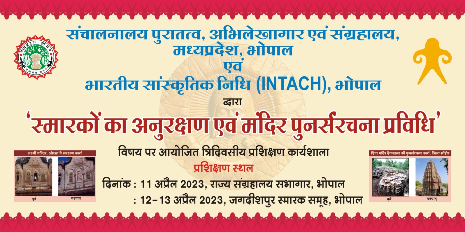 संचालनालय, पुरातत्व अभिलेखागार एवं संग्रहालय, भोपाल एवं इंटेक भोपाल द्वारा निविदाकाारों के लिए राज्य संरक्षित स्मारकों के अनुरक्षण एवं मंदिर पुनर्स्थापन के सबंध में त्रिदिवसीय प्रशिक्षण कार्यशाला का आयोजन किया जा रहा है। जिसमें 11/04/2023 को राज्य संग्रहालय, भोपाल एवं दिनांक 12-13/04/2023 जगदीशपुर स्मारक समूह भोपाल में आयोजित किया जा रहा है। जिसमेंं निविदाकाारों को पुरातत्व के संरिक्षत स्मारकों के अनुरक्षण एवं मंदिर पुनर्स्थापन कार्य किस प्रकार से संपादित किया जाना होगा इस संबंध में विस्त़त जानकारी वरिष्ठ अधिकारियों द्वारा प्रदान की जावेगी।