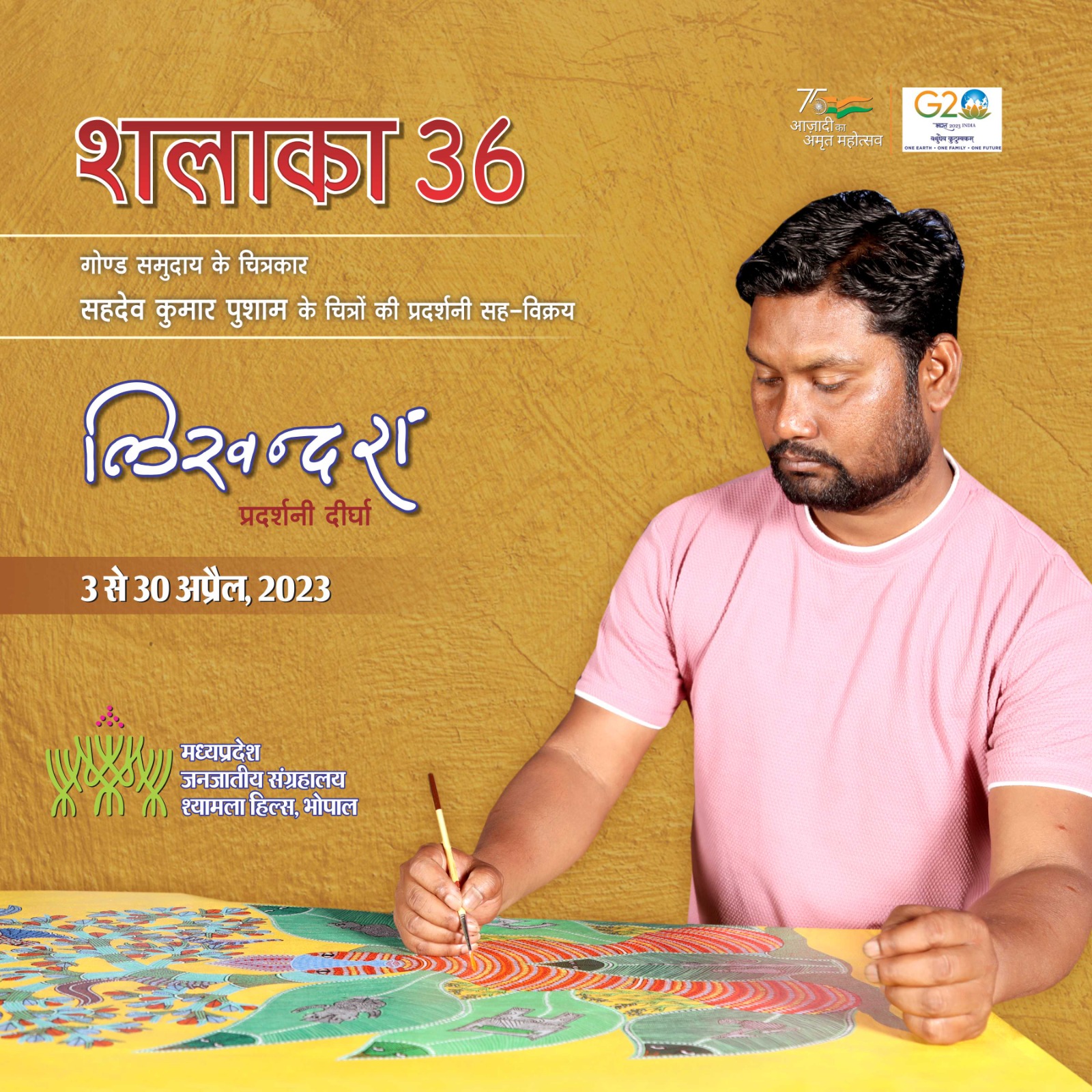 शलाका 36 गोण्ड समुदाय के चित्रकार सहदेव कुमार पुशाम के चित्रों की प्रदर्शनी सह-विक्रय लिखन्दरा प्रदर्शनी दीर्घा 3 से 30 अप्रैल, 2023 मध्यप्रदेश जनजातीय संग्रहालय श्यामला हिल्स, भोपाल
