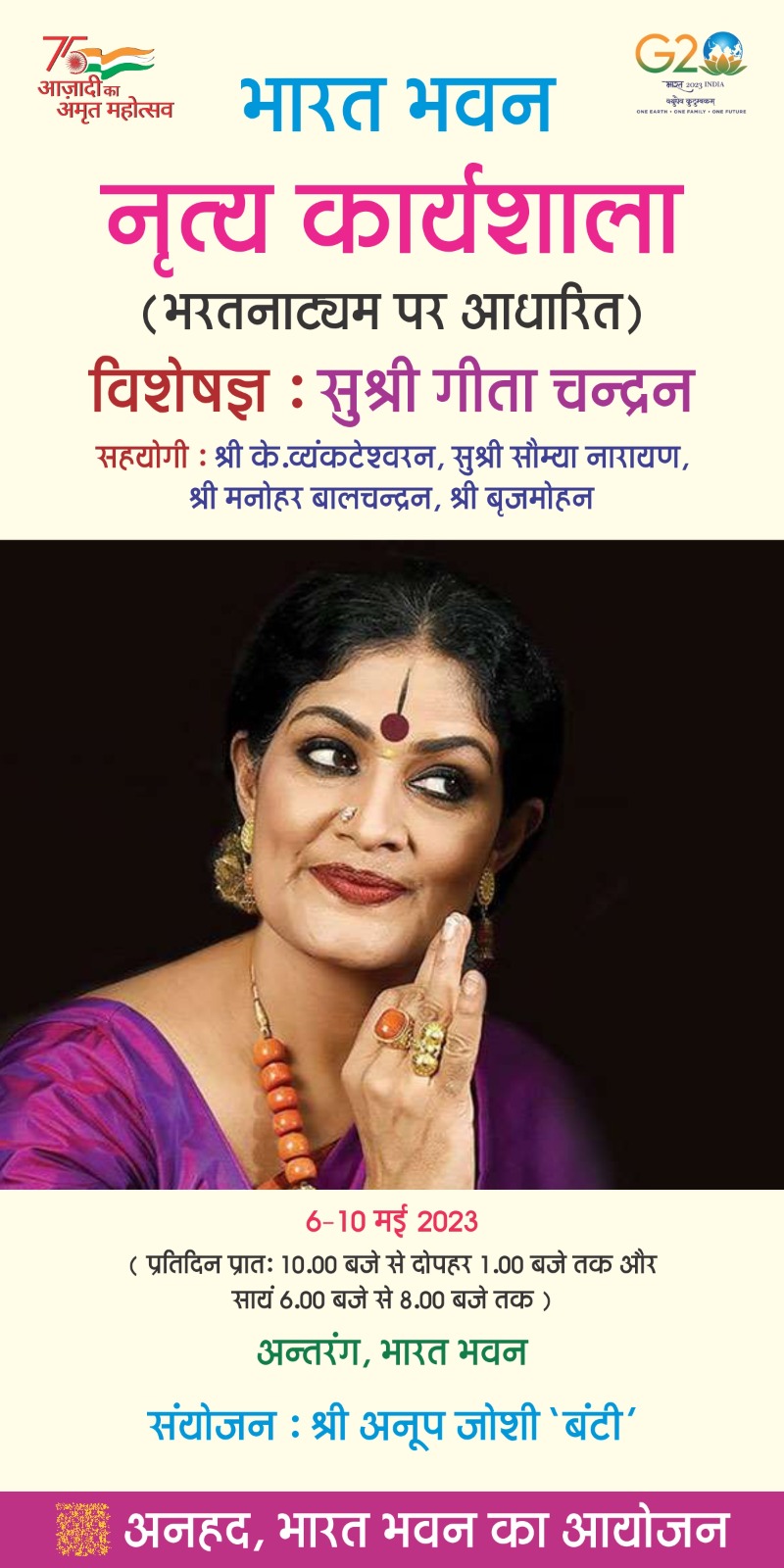 भारत भवन में नृत्य कार्यशाला ------------------------------------------- भारत भवन में 06 मई से 10 मई तक पाँच दिवसीय नृत्य कार्यशाला आयोजित की गई है। कार्यशाला का शुभारम्भ 06 मई को सुबह 10. 30 बजे होगा। नृत्य कार्यशाला की विशेषज्ञ प्रख्यात नृत्यांगना पद्मश्री सुश्री गीता चंद्रन जी हैं। कार्यशाला भरतनाट्यम नृत्य पर आधारित है। विशेष तौर पर शहर की सुप्रतिष्ठित भरतनाट्यम नृत्यांगनाओं के शिष्यों/ शिष्याओं को कार्यशाला में भागीदारी के लिए आमंत्रित किया गया है। इस नृत्य कार्यशाला के संयोजक श्री अनूप जोशी ' बंटी ' हैं। यह कार्यशाला भारत भवन के संगीत-नृत्य केन्द्र अनहद द्वारा पहली बार आयोजित की जा रही है।
