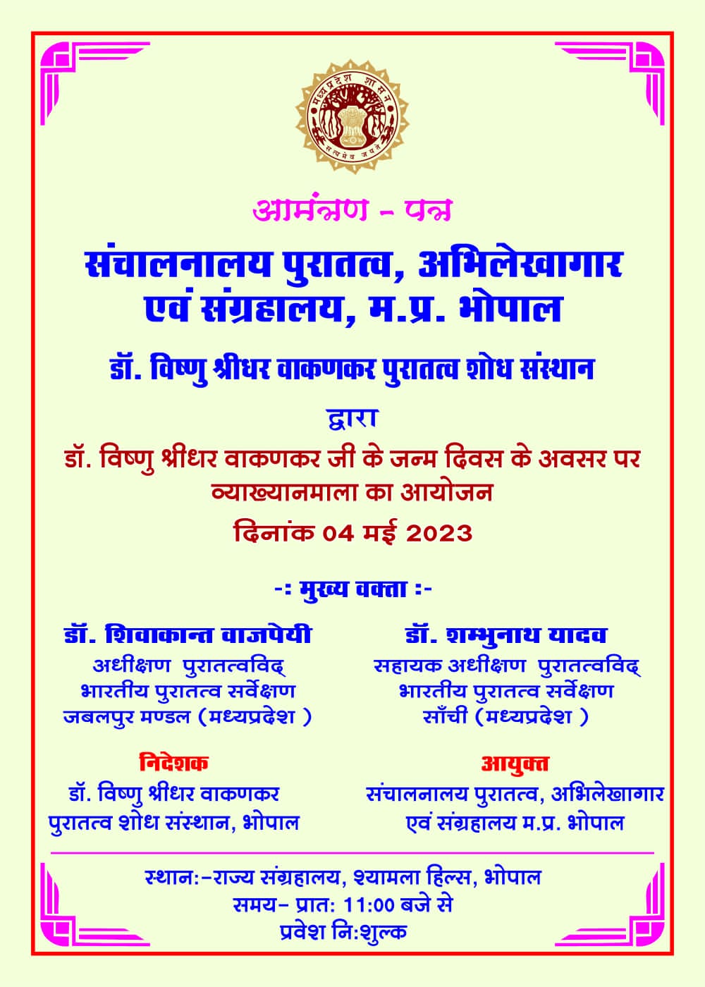 पदमश्री डॉ वाकणकर जी के जन्म दिवस के अवसर पर व्याख्यान माला जिसमें डॉ शिवाकांत वापजेयी, अधीक्षण पुराविद भारतीय पुरातत्व सवेक्षण जबलपुर ने बांधवगढ की नवीन खोज, डॉ शंभुनाथ यादव जी भारतीय पुरातत्व सवेक्षण सांची ने छत्तीसगढ के शैलचिृ व नवीन खोज की जानकारी साथ ही डॉ सत्यनारायण शर्मा ,इतिहास संकलन समिति मध्यक्षेेत्र संगठन मंत्री , सेवा- उपसचांलक श्री नागइच, क्षेत्रीय निदेशक भारतीय पुरातत्व सवेक्षण डॉ भुुवन विक्रम तथा अधीक्ष्ााणपुराविद डॉ मनोज कुमार कुर्मी जी द्वारा वाकणकर जी के व्यत्तिव पर व्याख्यान माला में प्रकाश डज्ञलेगें ।