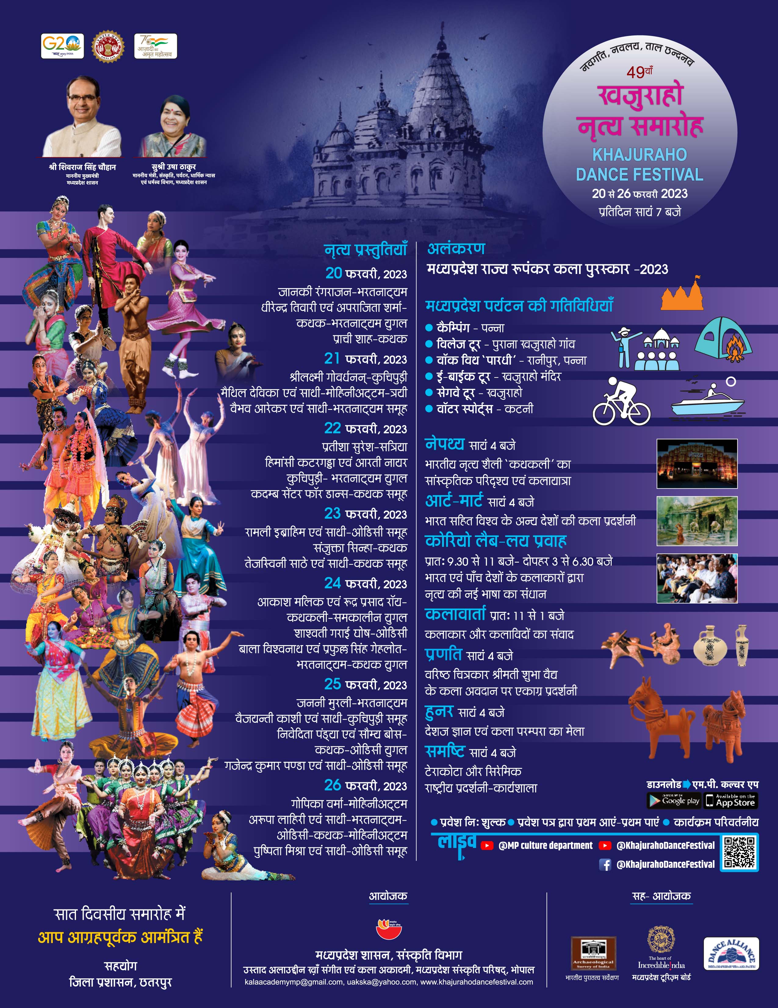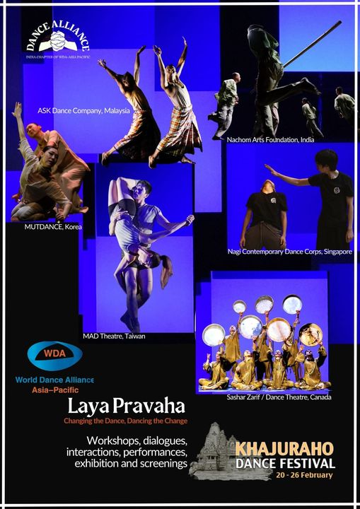 खजुराहो नृत्य समारोह-2023 (अतिरिक्त गतिविधियां) मध्यप्रदेश पर्यटन की गतिविधियाँ 1. कैम्पिंग - पन्ना 2. विलेज टूर - पुराना खजुराहो गांव 3. वॉक विथ पारथी - रानीपुर, पन्ना 4. ई-बाईक टूर - खुजराहो मंदिर 5. वॉटर स्पोर्ट्स - कटनी नेपथ्य सायं 4 बजे से भारतीय नृत्य शैली 'कथकली' का सांस्कृतिक परिदृश्य एवं कलायात्रा आर्ट-मार्ट सायं 4 बजे से भारत सहित विश्व के अन्य देशों की कला प्रदर्शनी कोरियो लैब-लय प्रवाह प्रातः 9.30 से 11 बजे- दोपहर 3 से 6.30 बजे भारत एवं पाँच देशों के नृत्य कलाकारों द्वारा नृत्य की नई भाषा का संधान कलावार्ता प्रातः 11 से 1 बजे कलाकार और कलाविदों का संवाद प्रणति सायं 4 बजे से वरिष्ठ चित्रकार श्रीमती शुभा वैद्य के कला अवदान पर एकाग्र प्रदर्शनी हुनर सायं 4 बजे से देशज ज्ञान एवं कला परम्परा का मेला समष्टि सायं 4 बजे से टेराकोटा और सिरेमिक राष्ट्रीय प्रदर्शनी-कार्यशाला मध्यप्रदेश राज्य रूपंकर कला पुरस्कार एवं प्रदर्शनी-2023