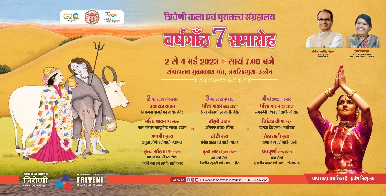 म.प्र. शासन संस्कृति विभाग द्वारा उज्जैन में स्थापित त्रिवेणी कला एवं पुरातत्त्व संग्रहालय के सातवे स्थापना दिवस के उपलक्ष्य में त्रिवेणी की प्रकृति के अनुरूप शैव, शाक्त तथा वैष्णव परंपराओं पर आधारित तीन दिवसीय व्याख्यान सत्र एवं सांस्कृतिक प्रस्तुतियों के आयोजन आगामी 02 से 04 मई 2023 तक संयोजित होंगे ।