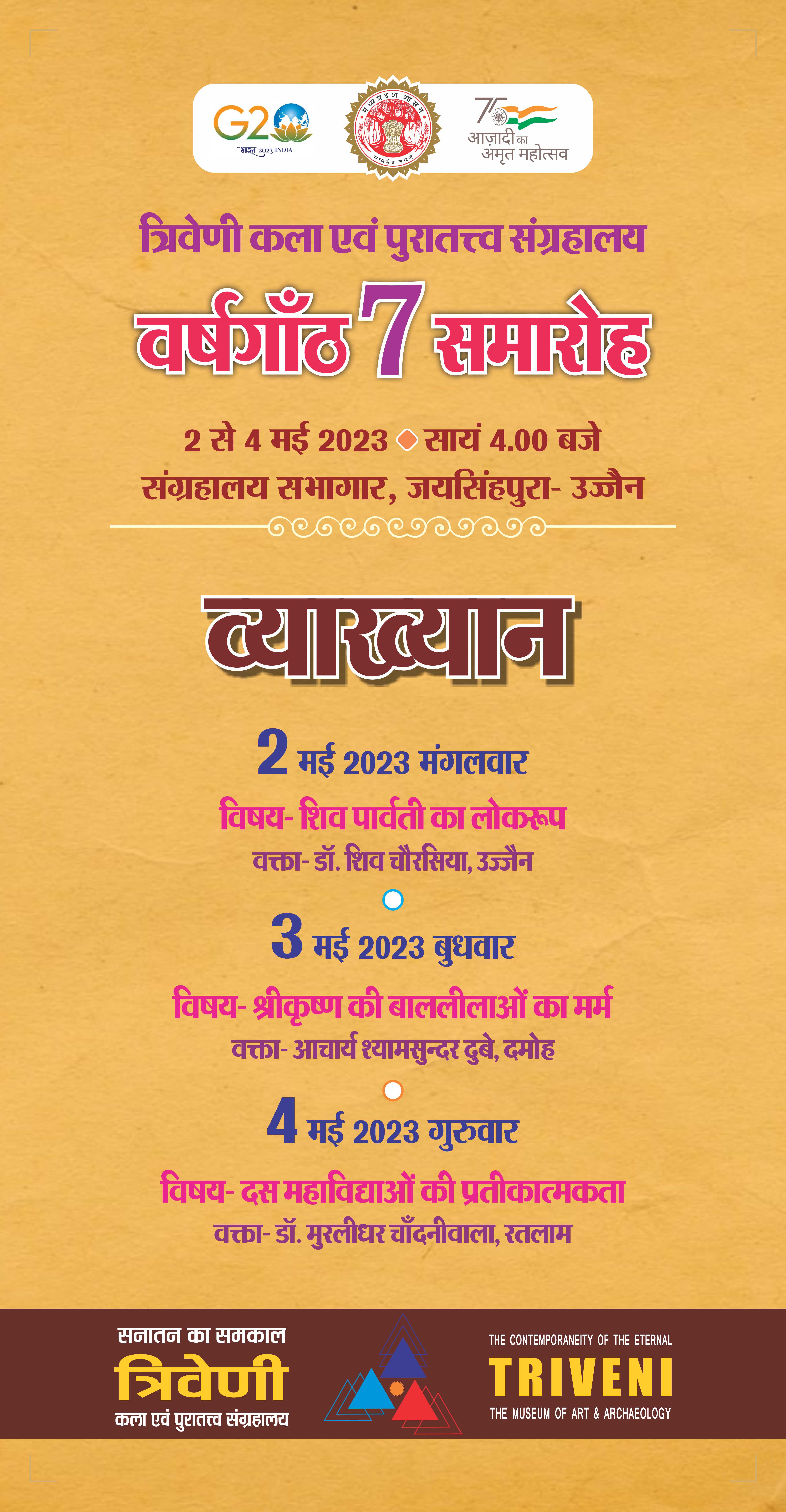म.प्र. शासन संस्कृति विभाग द्वारा उज्जैन में स्थापित त्रिवेणी कला एवं पुरातत्त्व संग्रहालय के सातवे स्थापना दिवस के उपलक्ष्य में त्रिवेणी की प्रकृति के अनुरूप शैव, शाक्त तथा वैष्णव परंपराओं पर आधारित तीन दिवसीय व्याख्यान सत्र एवं सांस्कृतिक प्रस्तुतियों के आयोजन आगामी 02 से 04 मई 2023 तक संयोजित होंगे ।