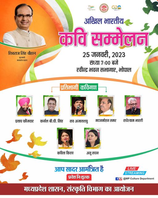 गणतंत्र दिवस की पूर्व संध्या पर अखिल भारतीय कवि सम्मेलन दिनांक : 25/01/2023 समय : सायं 7 बजे से स्थान : अंजनी सभागृह, रवीन्द्र भवन आप सभी सादर आमंत्रित हैं प्रवेश निःशुल्क मध्यप्रदेश शासन, संस्कृति विभाग का आयोजन
