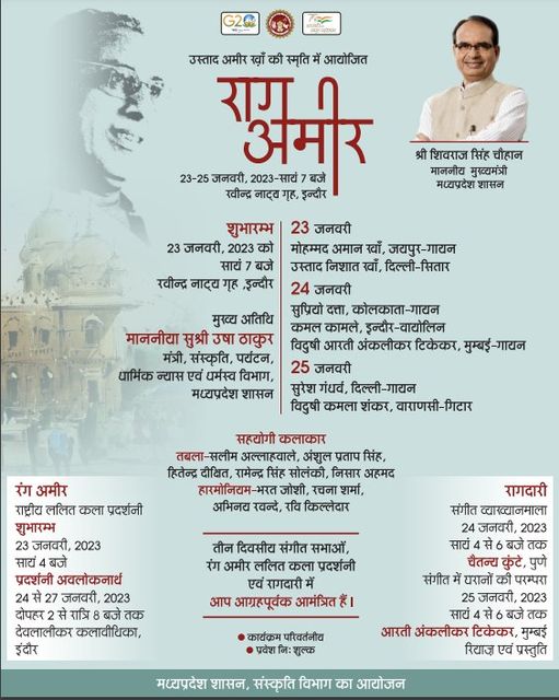 उस्ताद अमीर ख़ाँ की स्मृति में आयोजित राग अमीर 23 से 25 जनवरी, 2023 समय - संध्या 7:00 बजे स्थान - रवीन्द्र नाट्य गृह, इन्दौर मध्यप्रदेश शासन, संस्कृति विभाग का प्रतिष्ठा आयोजन