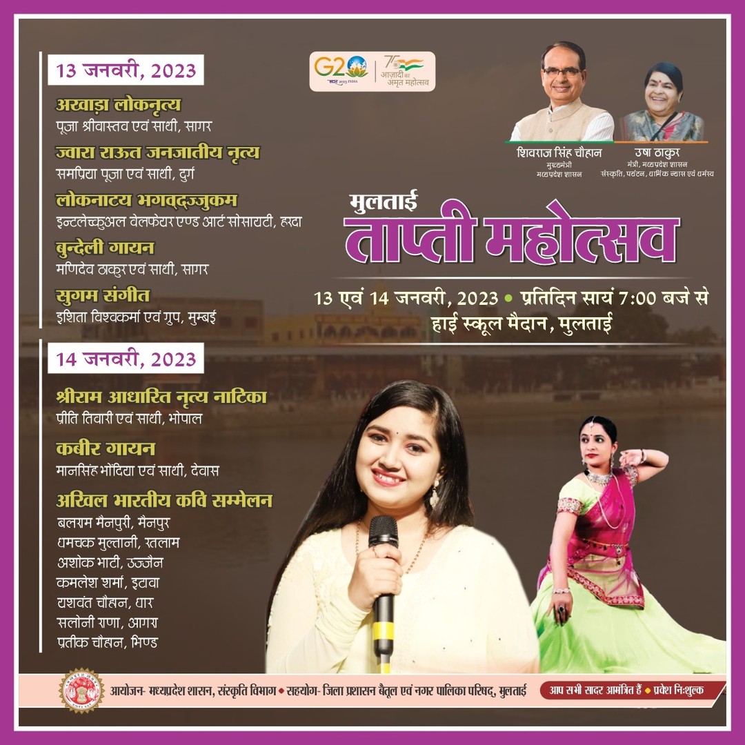 ताप्ती महोत्सव 13 - 14 जनवरी, 2023 प्रतिदिन सायं 7 बजे से, हाई स्कूल मैदान , मुलताई आप सभी सादर आमंत्रित हैं. (प्रवेश नि:शुल्क)