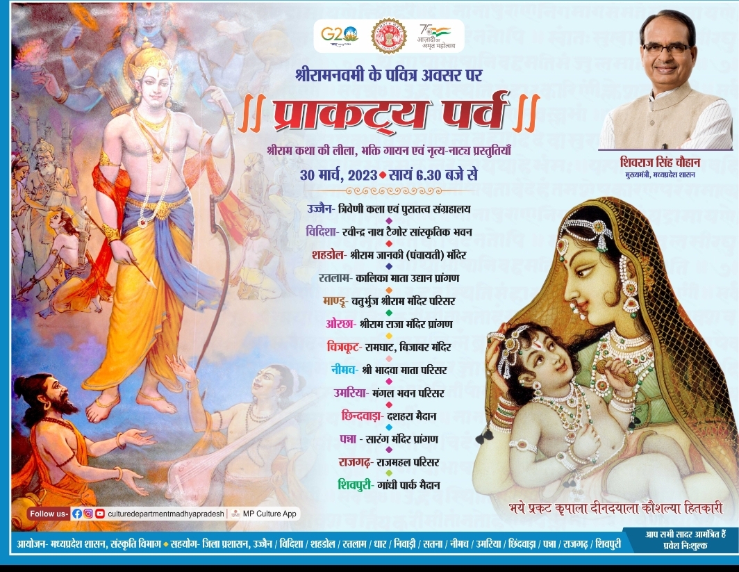 मध्यप्रदेश शासन, संस्कृति विभाग द्वारा रामनवमीं के पावन अवसर पर "प्राकट्य पर्व" का आयोजन एक साथ प्रदेश के 12 स्थानों पर किया जा रहा है। यह आयोजन 30 मार्च, 2023 को विदिशा, पन्ना, राजगढ़, शिवपुरी, छिंदवाड़ा, नीमच, रतलाम, ओरछा, शहडोल एवं उज्जैन में आयोजित होगा। इसके अलावा चित्रकूट में 24-30 मार्च, 2023 एवं उमरिया में 28-30 मार्च, 2023 तक प्राकट्य पर्व आयोजित किया जा रहा है। संचालक संस्कृति श्री अदिति कुमार त्रिपाठी ने बताया कि प्राकट्य पर्व के अंतर्गत श्रीराम आधारित कला प्रस्तुतियां मंचित की जायेंगी, जिसमें नृत्यनाटिका, भजन, गायन, नृत्य इत्यादि शामिल होंगे।