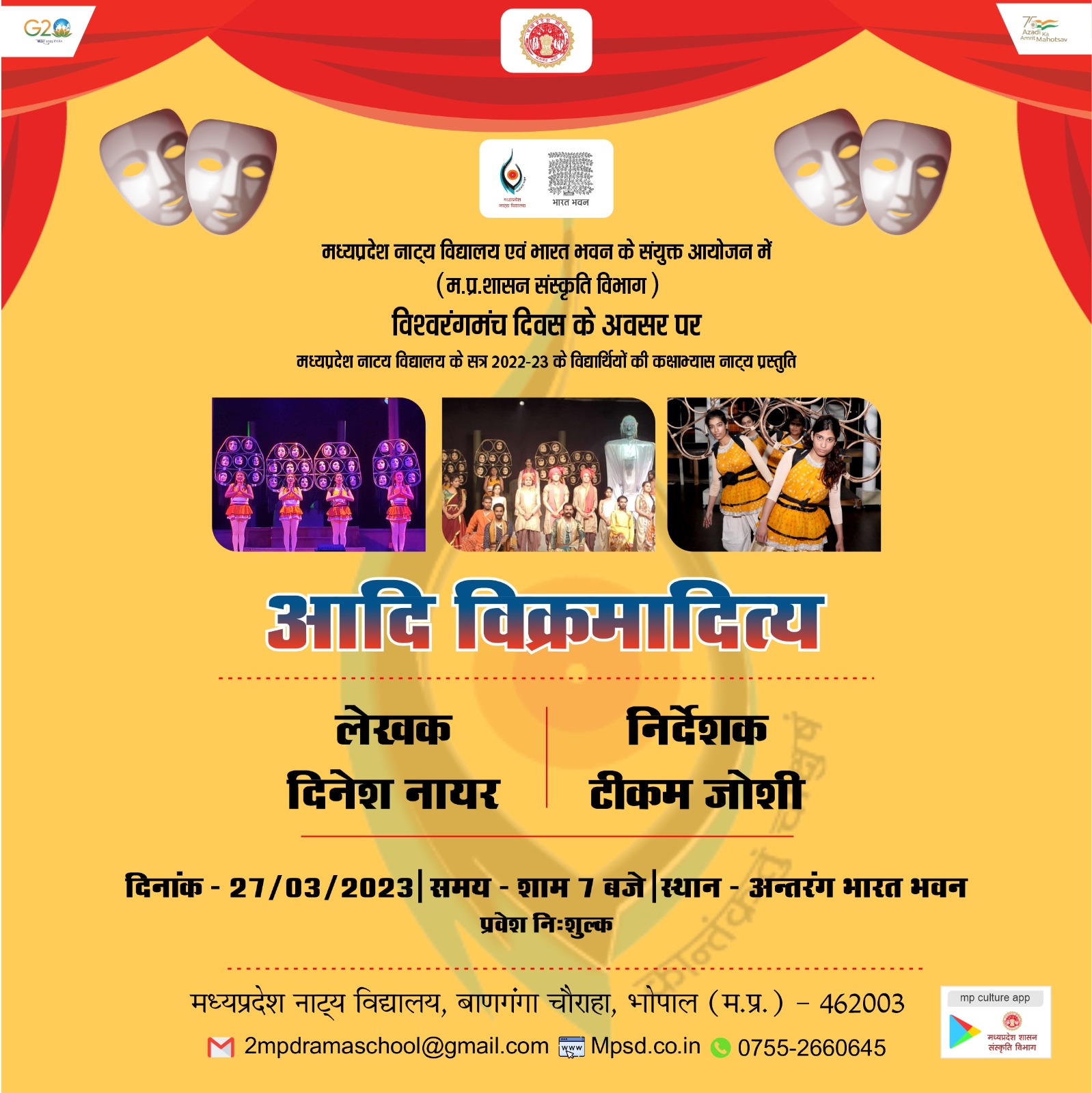मध्यप्रदेश नाट्य विद्यालय के वर्तमान सत्र 2022-23 के विद्यार्थियों के साथ श्री टीकम जोशी, निदेशक, मध्यप्रदेश नाट्य विद्यालय के निर्देशन में सम्राट विक्रमादित्य के जीवन पर आधारित कक्षाभ्यास नाट्य प्रस्तुति का प्रदर्शन विश्व रंगमंच दिवस के अवसर पर दिनांक 27 मार्च 2023 को मध्यप्रदेश नाट्य विद्यालय एवं भारत भवन के संयुक्त तत्वाधान में कक्षाभ्यास प्रस्तुति ‘‘सम्राट विक्रमादित्य’’ का मंचन भारत भवन के अंतरंग सभागार में किया जा रहा है।