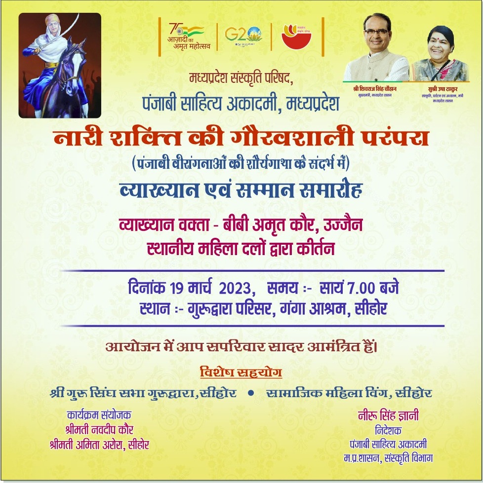 नारी शक्ति की गौरवशाली परंपरा (पंजाबी वीरांगनाओं की शौर्यगाथा के संदर्भ में) व्याख्यान एवं सम्मान समारोह व्याख्यान वक्ता - बीबी अमृत कौर, उज्जैन स्थानीय महिला दलों द्वारा कीर्तन दिनांक 19 मार्च 2023, समयः- साय 7.00 बजे स्थानः- गुरूद्वारा परिसर, गंगा आश्रम, सीहोर आयोजन में आप सहपरिवार सादर आमंत्रित हैं। विशेष सहयोग श्री गुरू सिंघ सभा गुरूद्वारा, सीहोर, सामाजिक महिला विंग सीहोर निदेशक नीरू सिंह ज्ञानी पंजाबी साहित्य अकादमी म.प्र. शासन, संस्कृति विभाग