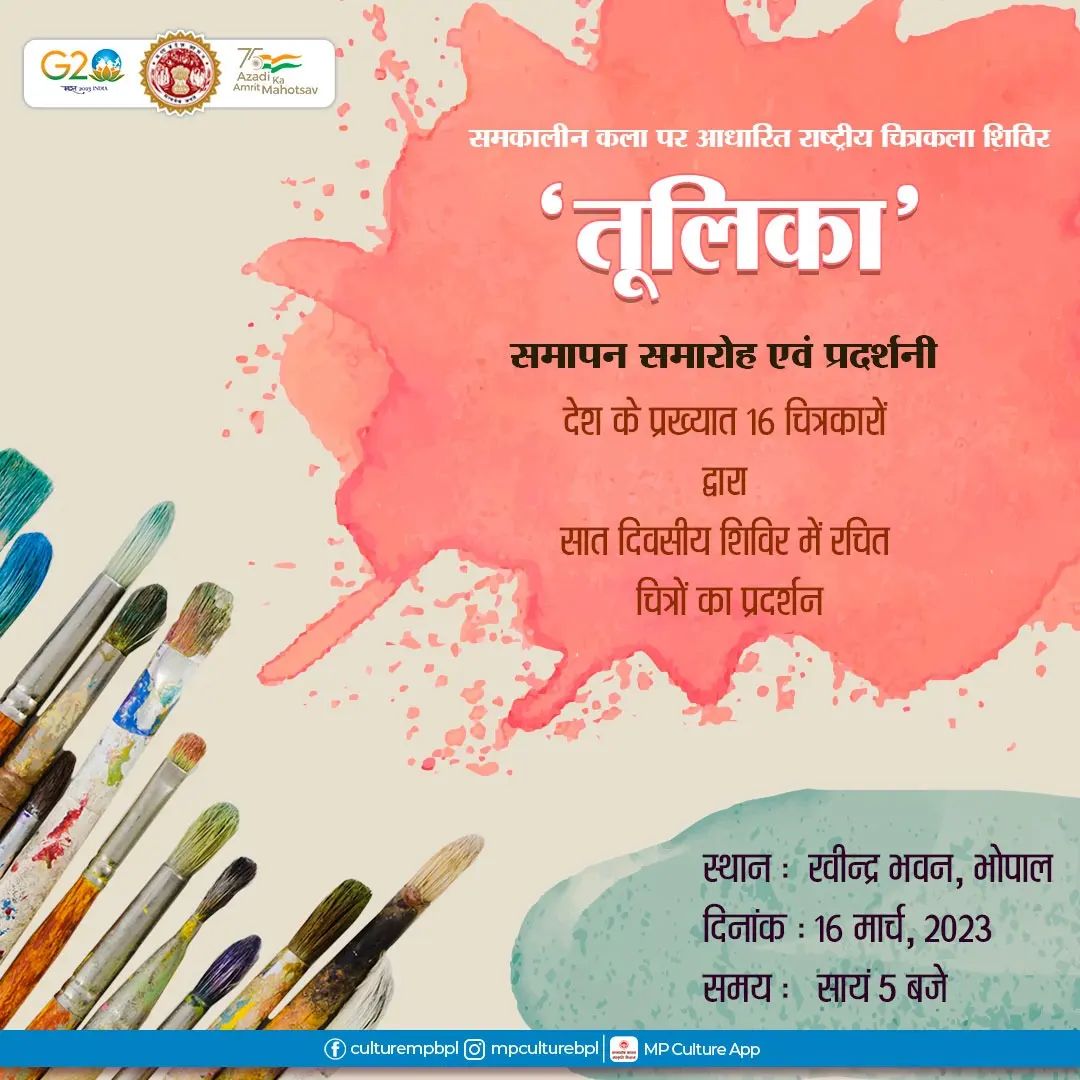 समकालीन कला पर आधारित राष्ट्रीय चित्रकला शिविर *‘तूलिका’* *समापन समारोह एवं प्रदर्शनी* (देश के प्रख्यात 16 चित्रकारों द्वारा सात दिवसीय शिविर में रचित चित्रों का प्रदर्शन) स्थान : रवीन्द्र भवन, भोपाल दिनांक : 16 मार्च, 2023 समय : सायं 5 बजे आप सभी सादर आमंत्रित हैं *मध्यप्रदेश शासन, संस्कृति विभाग का आयोजन*