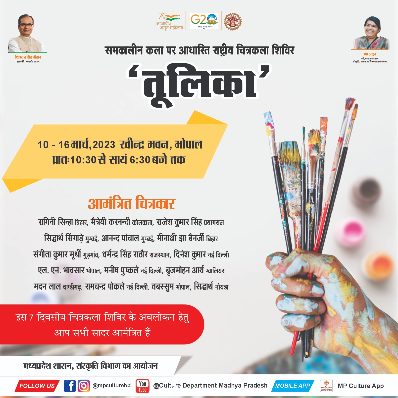 समकालीन कला पर आधारित राष्ट्रीय चित्रकला शिविर ‘तूलिका’ 10—16 मार्च, 2023, रवीन्द्र भवन, भोपाल प्रातः 10:30 से सायं 6:30 तक इस 7 दिवसीय राष्ट्रीय चित्रकला शिविर के अवलोकन हेतु आप सभी सादर आमंत्रित हैं मध्यप्रदेश शासन, संस्कृति विभाग का आयोजन