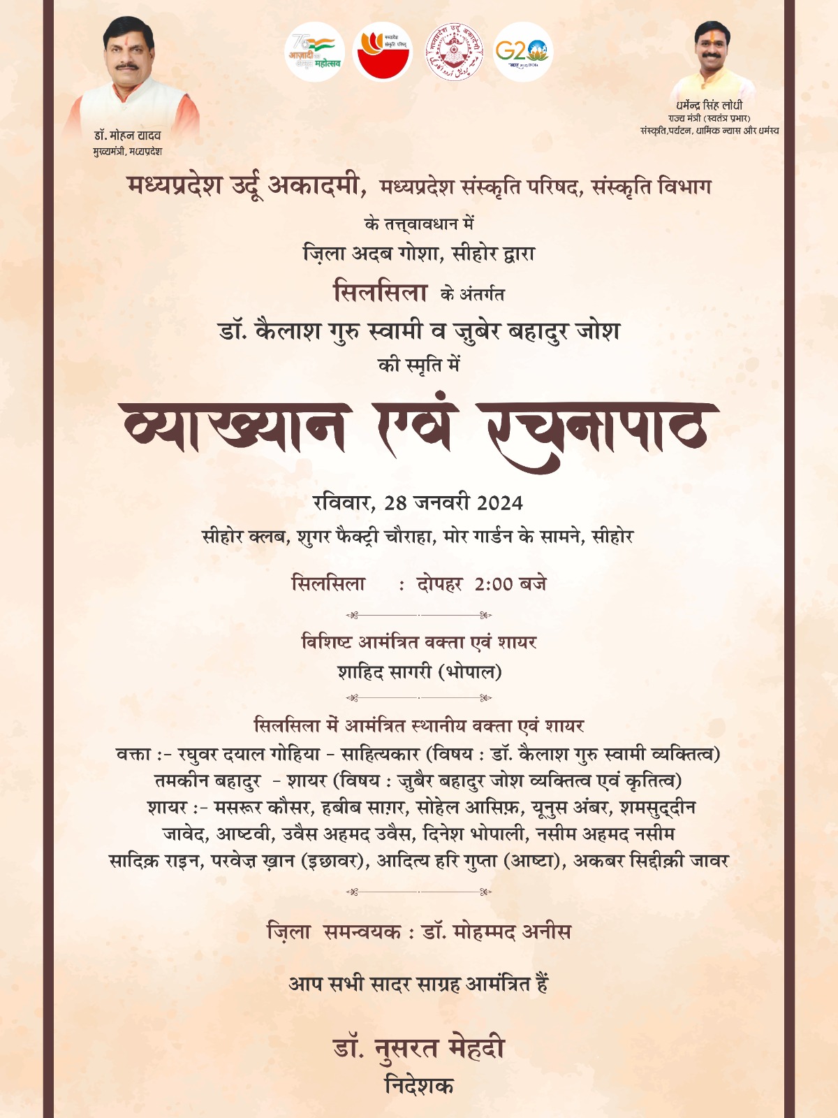 मध्यप्रदेश उर्दू अकादमी, मध्यप्रदेश संस्कृति परिषद, संस्कृति विभाग के तत्त्वावधान में ज़िला अदब गोशा, सीहोर द्वारा सिलसिला के अंतर्गत डॉ. कैलाश गुरु स्वामी व जुबेर बहादुर जोश की स्मृति में व्याख्यान एवं रचनापाठ रविवार, 28 जनवरी 2024 सीहोर क्लब, शुगर फैक्ट्री चौराहा, मोर गार्डन के सामने, सीहोर सिलसिला : दोपहर 2:00 बजे विशिष्ट आमंत्रित वक्ता एवं शायर शाहिद सागरी (भोपाल) सिलसिला में आमंत्रित स्थानीय वक्ता एवं शायर वक्ता :- रघुवर दयाल गोहिया साहित्यकार (विषय: डॉ. कैलाश गुरु स्वामी व्यक्तित्व) तमकीन बहादुर - शायर (विषय: जुबैर बहादुर जोश व्यक्तित्व एवं कृतित्व) शायर :- मसरूर कौसर, हबीब सागर, सोहेल आसिफ़, यूनुस अंबर, शमसुद्दीन जावेद, आष्टवी, उवैस अहमद उवैस, दिनेश भोपाली, नसीम अहमद नसीम, सादिक़ राइन, परवेज खान (इछावर), आदित्य हरि गुप्ता (आष्टा), अकबर सिद्दीक़ी जावर जिला समन्वयक : डॉ. मोहम्मद अनीस आप सभी सादर साग्रह आमंत्रित हैं डॉ. नुसरत मेहदी निदेशक