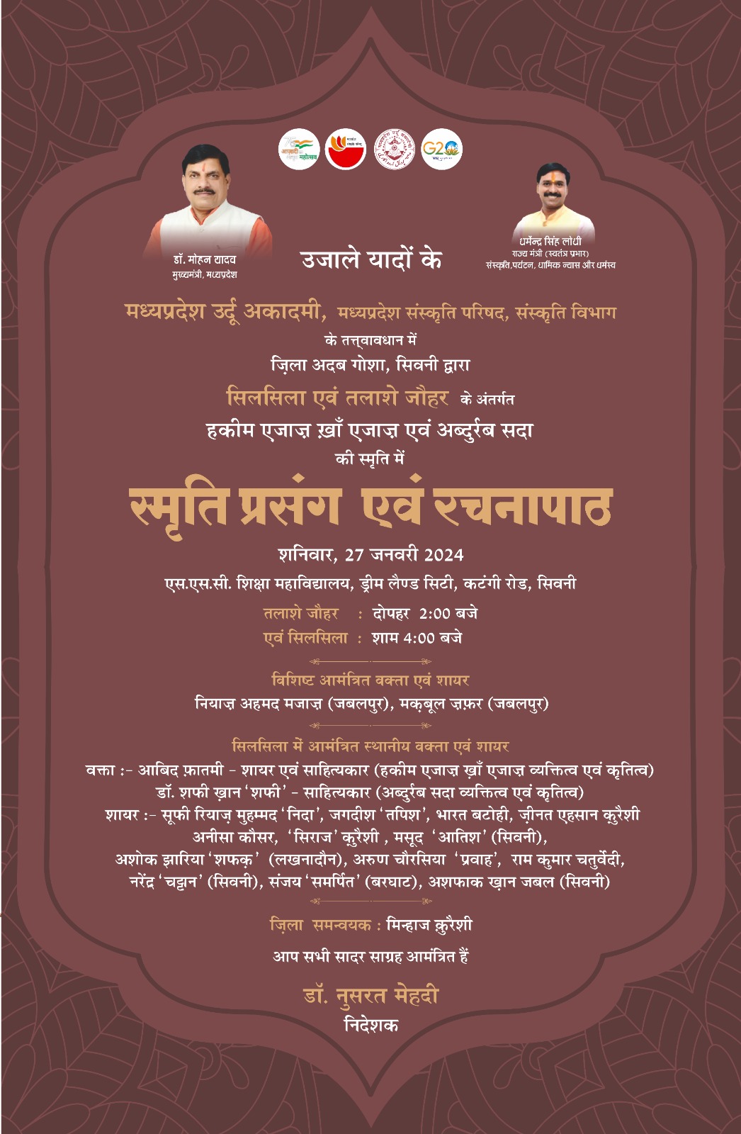#Seoni_District #Silsila #Talashe_Jauhar #mpurduacademy उजाले यादों के मध्यप्रदेश उर्दू अकादमी, मध्यप्रदेश संस्कृति परिषद, संस्कृति विभाग के तत्त्वावधान में जिला अदब गोशा, सिवनी द्वारा सिलसिला एवं तलाशे जौहर के अंतर्गत हकीम एजाज़ ख़ाँ एजाज़ एवं अब्दुर्रब सदा की स्मृति में स्मृति प्रसंग एवं रचनापाठ दिनांक : शनिवार, 27 जनवरी 2024 एस.एस.सी. शिक्षा महाविद्यालय, ड्रीम लैण्ड सिटी, कटंगी रोड, सिवनी तलाशे जौहर : दोपहर 2:00 बजे एवं सिलसिला : शाम 4:00 बजे विशिष्ट आमंत्रित वक्ता एवं शायर नियाज़ अहमद मजाज़ (जबलपुर), मकबूल जफ़र (जबलपुर) सिलसिला में आमंत्रित स्थानीय वक्ता एवं शायर वक्ता :- आबिद फ़ातमी शायर एवं साहित्यकार (हकीम एजाज़ ख़ाँ एजाज़ व्यक्तित्व एवं कृतित्व) डॉ. शफी खान 'शफी' साहित्यकार (अब्दुर्रब सदा व्यक्तित्व एवं कृतित्व) शायर :- सूफी रियाज़ मुहम्मद 'निदा', जगदीश 'तपिश', भारत बटोही, जीनत एहसान कुरैशी अनीसा कौसर, 'सिराज' कुरैशी, मसूद 'आतिश' (सिवनी), अशोक झारिया 'शफक' (लखनादौन), अरुण चौरसिया 'प्रवाह', राम कुमार चतुर्वेदी, नरेंद्र 'चट्टान' (सिवनी), संजय 'समर्पित' (बरघाट), अशफाक खान जबल (सिवनी) जिला समन्वयक : मिन्हाज कुरैशी आप सभी सादर साग्रह आमंत्रित हैं डॉ. नुसरत मेहदी निदेशक