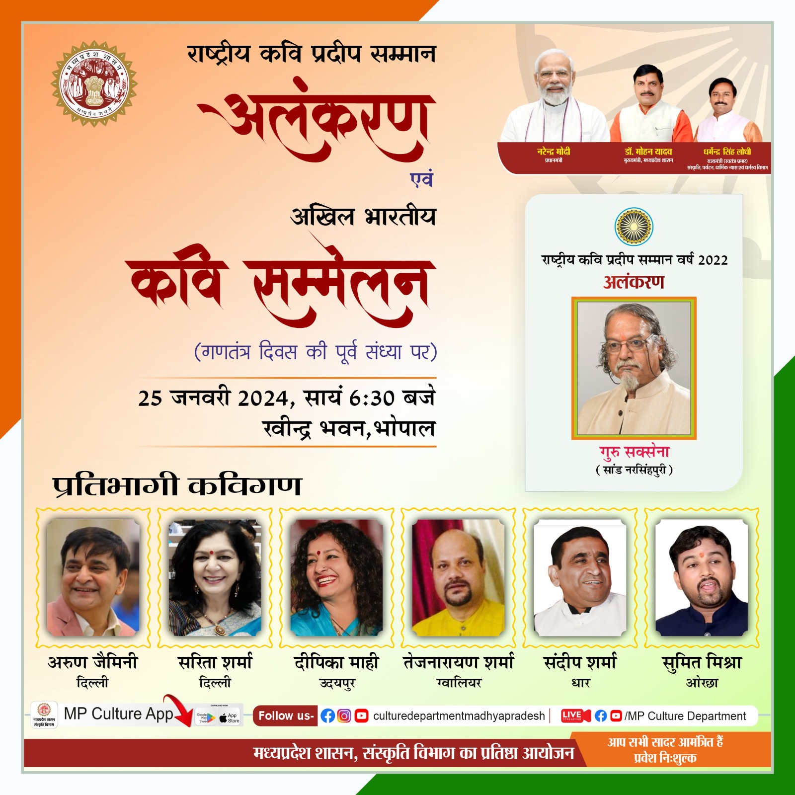 मध्यप्रदेश गणतंत्र दिवस की पूर्व संध्या पर 25 जनवरी 2024 को राष्ट्रीय कवि प्रदीप सम्मान अलंकरण समारोह एवं कवि सम्मेलन आयोजित किया जा रहा है। प्रवेश निःशुल्क है। आप सभी सादर आमंत्रित हैं। ।। मध्यप्रदेश शासन, संस्कृति विभाग का प्रतिष्ठा आयोजन।।