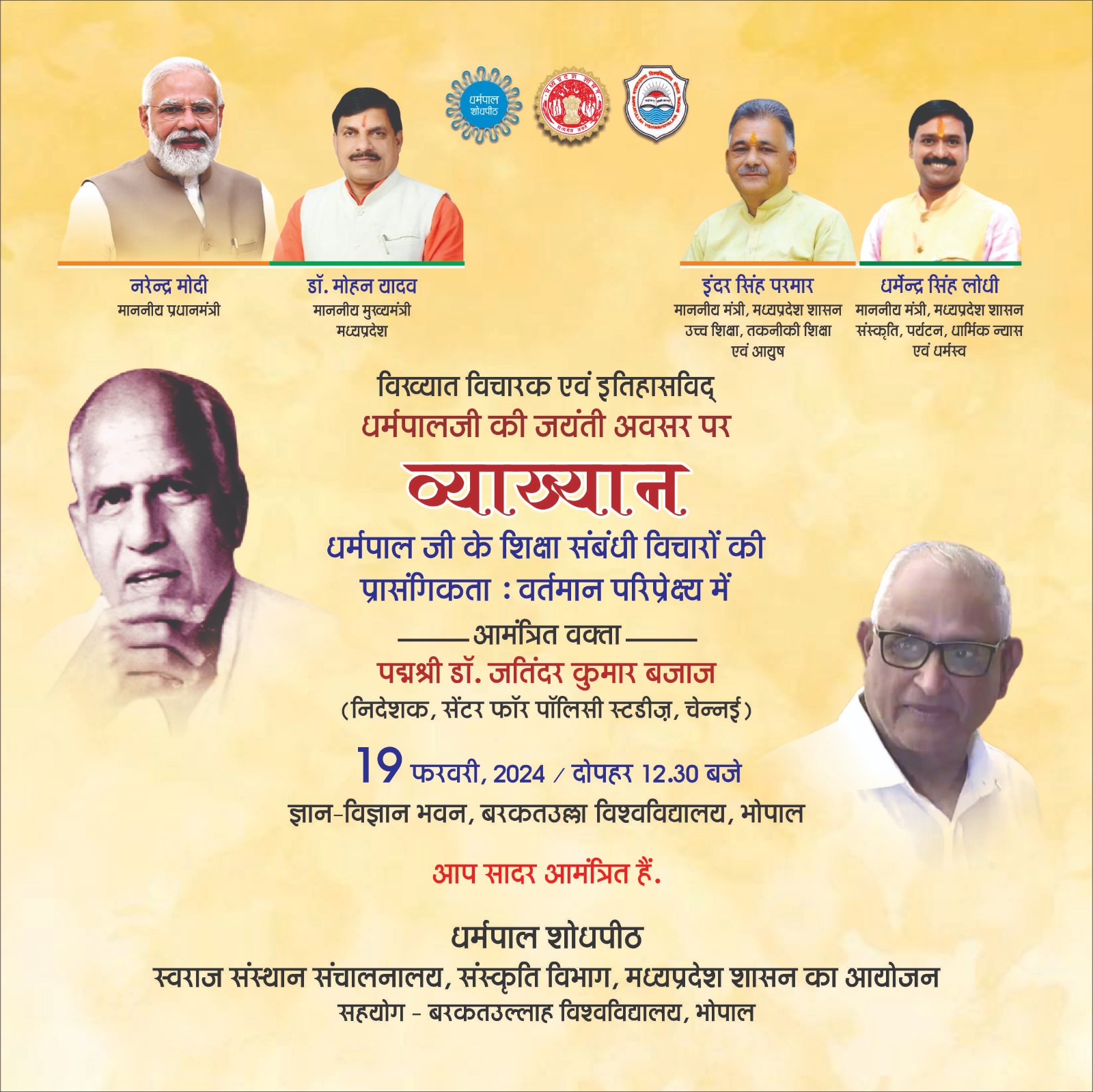 महान दार्शनिक विचारक और इतिहास के मर्मज्ञ धर्मपाल जी की जयंती के अवसर पर 19 फरवरी 2024 को धर्मपाल शोधपीठ, स्वराज संस्थान संचालनालय द्वारा बरकतुल्लाह विश्वविद्यालय के सहयोग से एक व्याख्यान का आयोजन किया जा रहा है । इस व्याख्यान का विषय है वर्तमान परिप्रेक्ष्य में धर्मपाल जी के शिक्षा संबंधी विचारों की प्रासंगिकता और इस पर वक्तव्य देंगे सेंटर फॉर पॉलिसी स्टडीज के निदेशक तथा आईसीएसएसआर के पूर्व प्रमुख पद्मश्री डॉ जतिंदर कुमार बजाज। माननीय मंत्री उच्च शिक्षा तकनीकी शिक्षा तथा आयुष श्री इंदर सिंह परमार जी के मुख्य आतिथ्य में यह कार्यक्रम बरकतुल्लाह विश्वविद्यालय के ज्ञान विज्ञान भवन में दोपहर 12:30 से प्रारंभ होगा