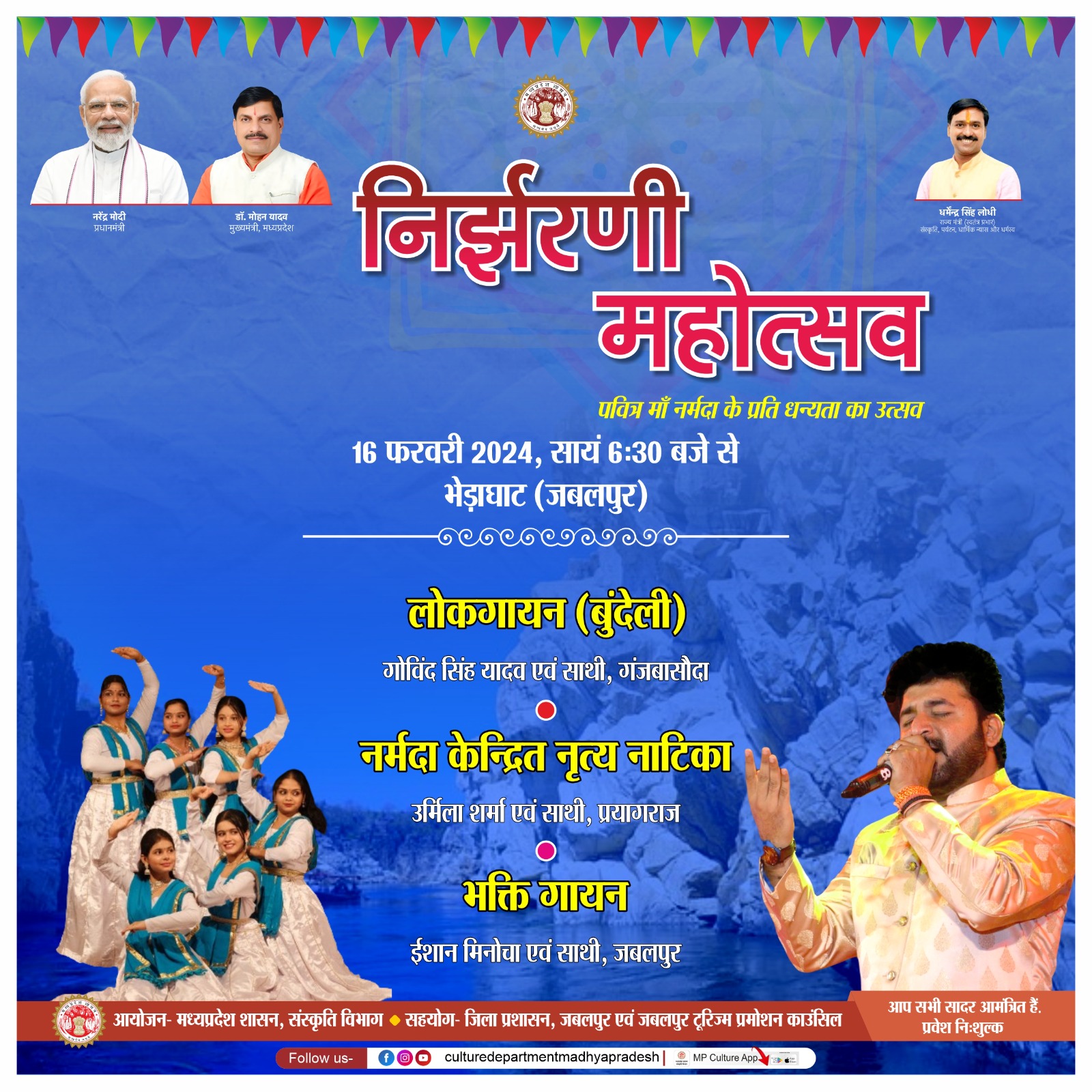 मध्यप्रदेश शासन, संस्कृति विभाग का प्रतिष्ठा आयोजन “निर्झरणी महोत्सव” 15-16 फरवरी, 2024 को होगा। पवित्र मां नर्मदा के प्रति धन्यता का उत्सव नर्मदापुरम, जबलपुर, नरसिंहपुर, देवास, ओंकारेश्वर, मंडलेश्वर, धार एवं बड़वानी में आयोजित होगा। इस दौरान विभिन्न कलाकार लोक गायन, नृत्य-नाटिका, भक्ति गायन के कार्यक्रम प्रस्तुत करेंगे। इन कार्यक्रमों में प्रवेश निःशुल्क है। आप सभी सादर आमंत्रित हैं।