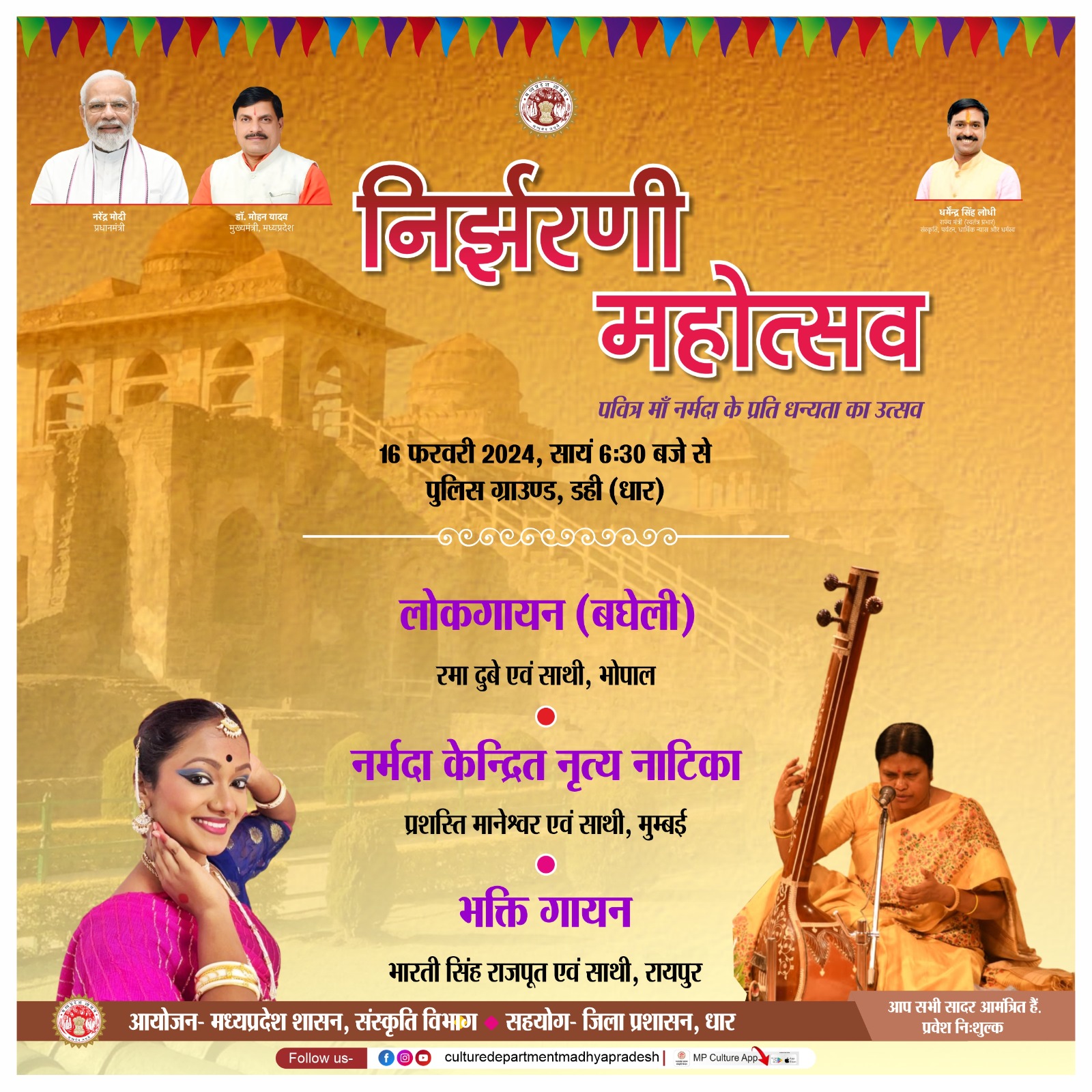 मध्यप्रदेश शासन, संस्कृति विभाग का प्रतिष्ठा आयोजन “निर्झरणी महोत्सव” 15-16 फरवरी, 2024 को होगा। पवित्र मां नर्मदा के प्रति धन्यता का उत्सव नर्मदापुरम, जबलपुर, नरसिंहपुर, देवास, ओंकारेश्वर, मंडलेश्वर, धार एवं बड़वानी में आयोजित होगा। इस दौरान विभिन्न कलाकार लोक गायन, नृत्य-नाटिका, भक्ति गायन के कार्यक्रम प्रस्तुत करेंगे। इन कार्यक्रमों में प्रवेश निःशुल्क है। आप सभी सादर आमंत्रित हैं।